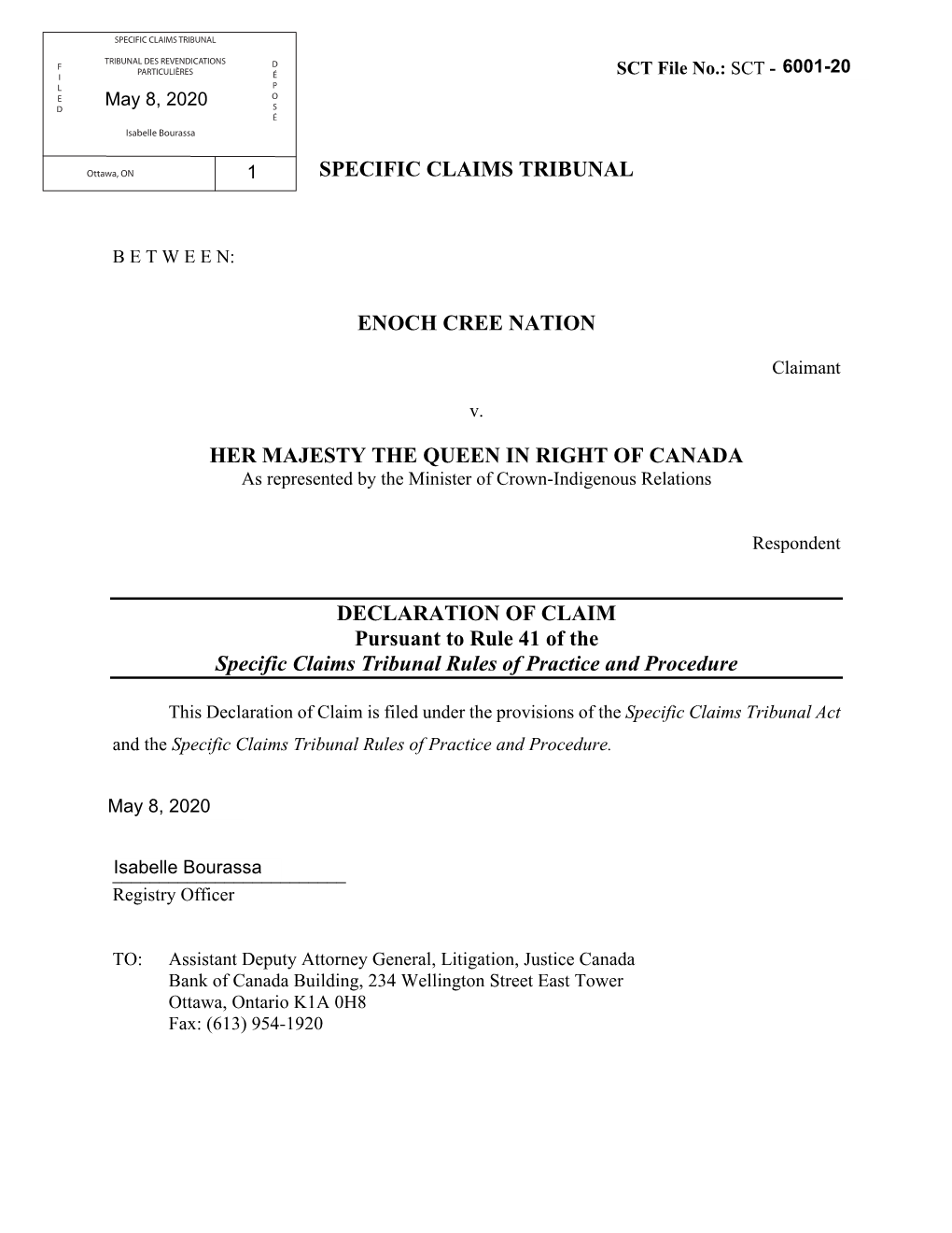 Specific Claims Tribunal Enoch Cree Nation Her