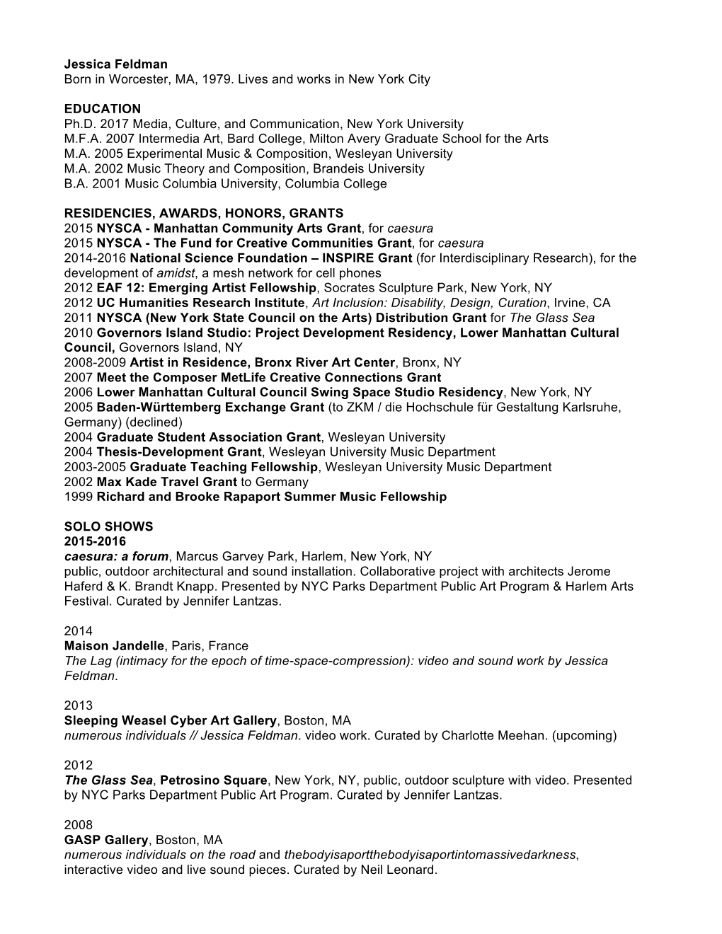 Jessica Feldman Artist's Resume 2016
