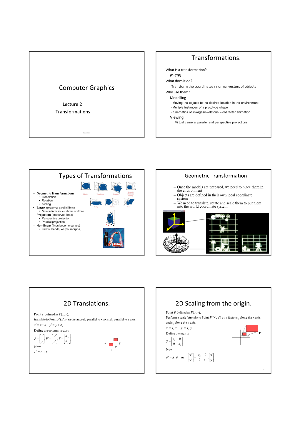 CMSC427 Transformations I Credit: slides 9+ from Prof. Zwicker Transformations: outline • Types of transformations • Specific: translation, rotation, scaling, shearing • Classes: rigid, affine, projective • Representing transformations • Unifying representation with homogeneous coordinates • Transformations represented as matrices • Composing transformations • Sequencing matrices • Sequencing using OpenGL stack model • Transformation examples • Rotating or scaling about a point • Rotating to a new coordinate frame • Applications • Modeling transformations (NOW) • Viewing transformations (LATER) Modeling with transformations • Create instance of • Object coordinate object in object space coordinate space • Create circle at origin • Transform object to • World coordinate space world coordinate space • Scale by 1.5 • Move down by 2 unit • Do so for other objects • Two rects make hat • Three circles make body • Two lines make arms Classes of transformations • Rigid • Affine • Translate, rotate, • Translate, rotate, scale uniform scale (non-uniform), shear, • No distortion to object reflect • Limited distortions • Preserve parallel lines Classes of transformations • Affine • Projective • Preserves parallel lines • Foreshortens • Lines converge • For viewing/rendering Classes of transformations: summary • Affine • Reshape, size object • Rigid • Place, move object • Projective • View object • Later … • Non-linear, arbitrary • Twists, pinches, pulls • Not in this unit First try: scale and rotate vertices in vector notation • Scale a point p by -