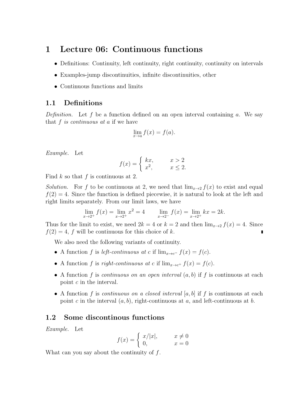12 Lecture 3 Vector Spaces of Functions 3.1 Space of Continuous Functions C(I) Let I ⊆ R be an interval. Then I is of the form (for some a < b) 8 > fx 2 Rj a < x < bg; an open interval; <> fx 2 Rj a · x · bg; a closed interval; I = > fx 2 Rj a · x < bg :> fx 2 Rj a < x · bg: Recall that the space of all functions f : I ¡! R is a vector space. We will now list some important subspaces: Example (1). Let C(I) be the space of all continuous functions on I. If f and g are continuous, so are the functions f + g and rf (r 2 R). Hence C(I) is a vector space. Recall, that a function is continuous, if the graph has no gaps. This can be formulated in di®erent ways: a) Let x0 2 I and let ² > 0 . Then there exists a ± > 0 such that for all x 2 I \ (x0 ¡ ±; x0 + ±) we have jf(x) ¡ f(x0)j < ² This tells us that the value of f at nearby points is arbitrarily close to the value of f at x0. 13 14 LECTURE 3. VECTOR SPACES OF FUNCTIONS b) A reformulation of (a) is: lim f(x) = f(x0) x!x0 3.2 Space of continuously di®erentiable func- tions C1(I) Example (2). The space C1(I). Here we assume that I is open. Recall that f is di®erentiable at x0 if f(x) ¡ f(x0) f(x0 + h) ¡ f(x0) 0 lim = lim =: f (x0) x!x0 x ¡ x0 h!0 h 0 exists. -