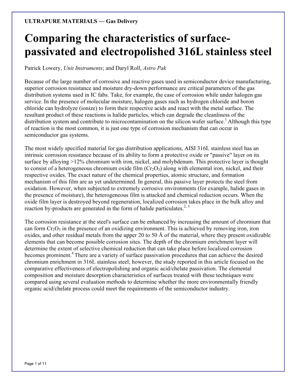 Technical Article Page 1 of 4 Why Passivate Stainless Steel and What Happens If You Don’t By: Patrick H. Banes, Astro Pak Corporation To insure having the maximum corrosion resistance that austenitic stainless steel has to offer, the stainless steel surface must be in a passive state. The passive condition on the surface of the stainless steel is obtained by formation of a chromium oxide film on the metal‘s surface. This is accomplished by passivating the metal. Chemical passivation procedures using alkalines, wetting agents, chelants, and organic or inorganic acids are used to clean the metal surface thoroughly and in conjunction with an oxygen rich atmosphere, a uniform chromium oxide film forms. The key is to have a uniform chromium oxide film with an acceptable chrome to iron ratio (typically>1) and thickness (20-50) angstroms. Passivation is required to restore or enhance the chromium oxide film on the stainless steel surface when it has been manipulated by surface finishing, welding, grinding, external contamination, etc. Mechanical finishing of stainless steel surfaces allows for a very smooth surface and is a prerequisite for sub- sequent electro-polishing. The mechanical action disrupts the existing passive surface and results in a surface with a low chrome to iron ratio. The possibility of surface contamination getting pushed or smeared into the metal surface or sub-surface also exists. Welding stainless steel is one of the primary reasons for passivating. The metal surface is altered and free iron is released from the alloy. The chrome to iron ratio is also lowered in the heat affected zone of the weld. -
