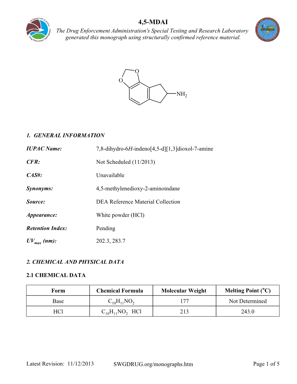 4,5-MDAI the Drug Enforcement Administration's Special Testing and Research Laboratory Generated This Monograph Using Structurally Confirmed Reference Material