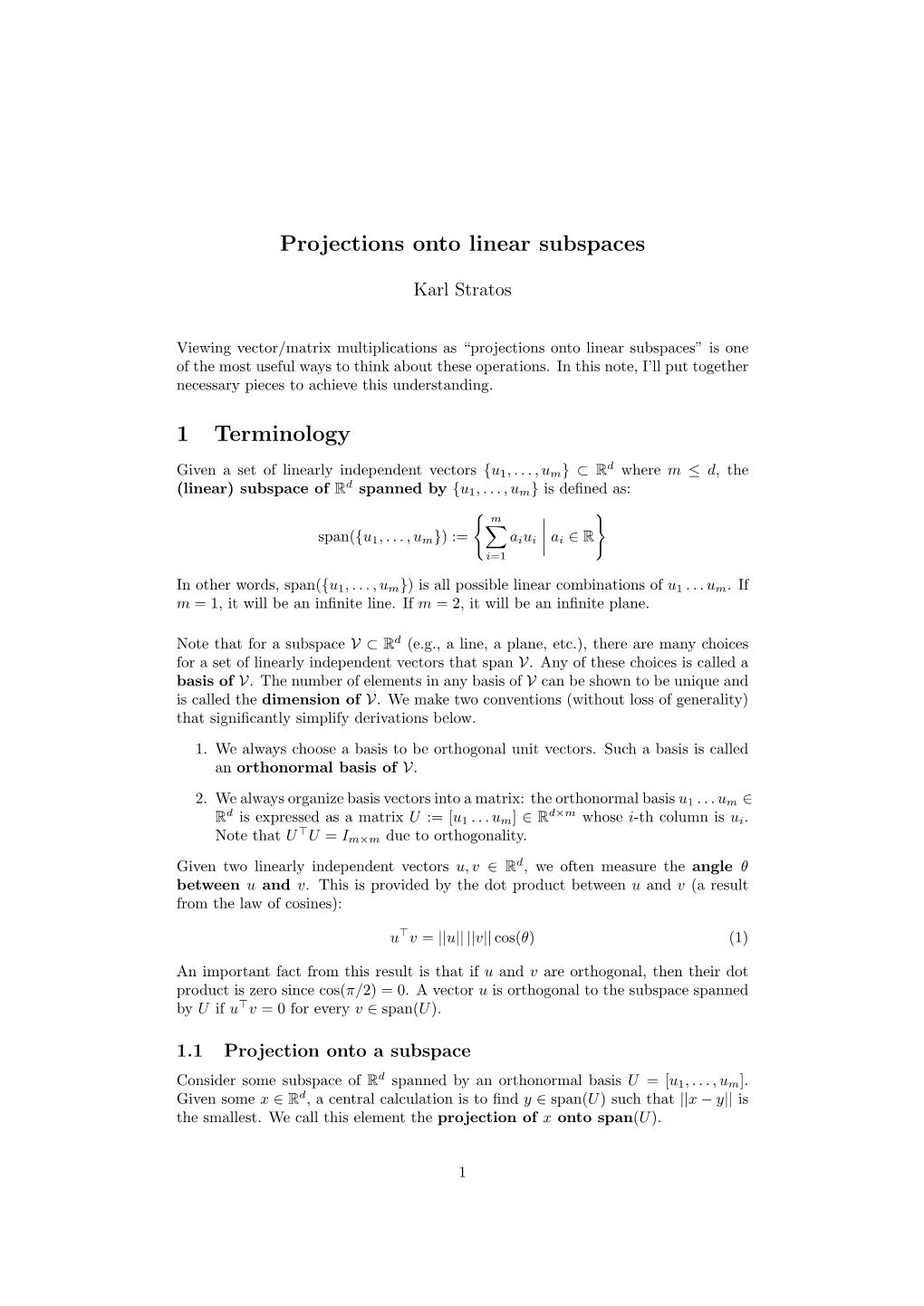 LINEAR SUBSPACES 1. Subspaces of Rn We wish to generalize the notion of lines and planes. To that end, say a subset W ⊂ Rn is a (linear) subspace if it has the following three properties: (1) (Non-empty): ~0 2 W ; (2) (Closed under addition): ~v1;~v2 2 W ) ~v1 + ~v2 2 W ; (3) (Closed under scaling): ~v 2 W and k 2 R ) k~v 2 W . n o EXAMPLE: ~0 and Rn are subspaces of Rn for any n ≥ 1. 1 EXAMPLE: Line t : t 2 given by x = x is a subspace. 1 R 1 2 x 1 1 NON-EXAMPLE: W = : x ≥ 0; y ≥ 0 . As 2 W; but − 62 W: y 1 1 EXAMPLE: If T : Rm ! Rn, then ker(T ) is a subspace and Rm and Im (T ) is a subspace of Rn. For instance, (1) T (~0) = ~0 ) ~0 2 ker(T ); (2) ~v1;~v2 2 ker(T ) ) T (~v1 + ~v2) = T (~v1) + T (~v2) = ~0 ) ~v1 + ~v2 2 ker(T ); (3) ~v 2 ker(T ); k 2 R ! T (k~v) = kT (~v) = k~0 = ~0 ) k~v 2 ker(T ): 2. Span of vectors n Given a set of vectors ~v1; : : : ;~vm 2 R we define the span of these vectors to be W = span(~v1; : : : ;~vk) = fc1~v1 + ::: + ck~vk : c1; : : : ; cm 2 Rg In other words, ~w 2 W means ~w is a linear combination of the ~vi. If A = ~v1 j · · · j ~vm is the n × m matrix with columns ~vi, then span(~v1; : : : ;~vk) = Im (A) n and so span(~v1; : : : ;~vk) is a subspace of R . -