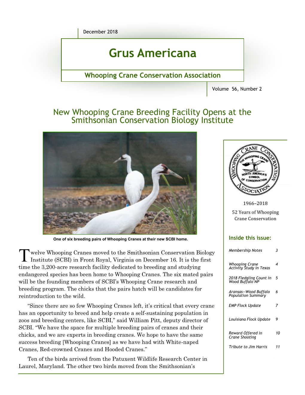 - Newsletter of the North American Crane Working Group - Vol. 29 No. 2 Fall 2018 — Fall 2019 President’s Report he North American Crane Workshop is T the key activity of the North American Crane Working Group. Workshop 15 will be held 8-11 January 2020 in Lubbock, Texas. NACWG is finalizing preparations, especially with the great job done by Dr. Blake Grisham and Kathy Brautigam, Texas Tech University, on local arrangements. Two days of presentations will include a Plenary session on Texas High Plains issues plus special Symposia on the past 10 years of research on the Aransas-Wood Buffalo whooping crane population, effects of telemetry and marking on cranes, and human dimensions of crane conservation. Overall, the science program includes 34 oral and 14 poster presentations (see pages 16-19). Two student travel awards have been granted. The Workshop will provide Sandhill Cranes at Muleshoe National Wildlife Refuge field trips to view wildlife and habitat management on nearby Muleshoe National Photo: Christena Stephens Wildlife Refuge and a local ranch. An introductory social will include a Texas BBQ dinner and special presentations. Other activities include a silent auction, open business meeting to elect the Working Group Board and plan for the next workshop, and the concluding Banquet, highlighted by presentation of the Walkinshaw Award, our most prestigious recognition of merit. Registration is now open and along with more details can be found on our website at: http://www.nacwg.org/ workshop15.html Your Board of Directors welcomes your input. Let us know how we are doing and feel free to offer your suggestions on how we can further contribute to conservation of cranes in North America. -