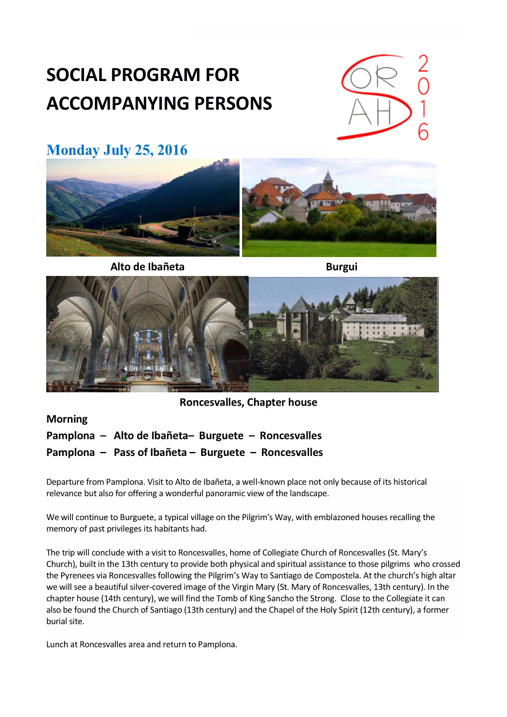 RONCESVALLES 2020 JUBILAR YEAR VIII CENTENARY CONSECRATION OF THE ROYAL COLLEGIATE (July, 17th 2020- July, 17th 2021) ORGANIZATION SPONSOR Arzobispado de Pamplona-Tudela Etxenike Asociación de Amigos de la Colegiata MAGNA Real Colegiata de Roncesvalles. Banco Santander Consejo Navarro del Movimiento Europeo Señorío de Sarría URIEL P a g e 1 | 28 RELIGIOUS ACTS JULY 2020 July 17th 2020, Friday: Centennial Date July 18th 2020, Saturday: Commemoration of the Centenary of the Consecration of the Royal Collegiate Church of Roncesvalles Official opening of the Jubilee Year of Santa María de Roncesvalles Place: Collegiate 18h- Solemn Eucharist presided by D. Francisco Pérez González, Archbishop of Pamplona and Bishop of Tudela. Mass sung. Invitation to religious, civil and military authorities. 19h- Concert after mass in the same collegiate church Music by the Corals Auzperri, Espinal, Orreaga, Aezkoa, and group Zorongo 19:30h- Visit to the college buildings and Museum July 25th 2020, Monday-Saturday: Santiago’s Day Place: Royal Collegiate Church of Roncesvalles 18h- Solemn Eucharist in memory of the victims of the Covid-19 pandemic AUGUST 2020 August 15th 2020, Saturday: Anniversary of the Battle of Roncesvalles (15 / 8/ 778) 18h- Solemn Eucharist of the Assumption of Our Lady, in memory of those who died in the battle of Roncesvalles Musical performance by the Zaraitzu choir, from the Salazar valley 18h- Procession to the Silo of Charlemagne, where a response will be prayed for those killed in battle. Inauguration and blessing of the new columbarium 19.30h.- Explanation of the current state of the Silo excavations by Francisco José Valle de Tarazaga Montero (ADITU Arkeologia), responsible for the excavation. -