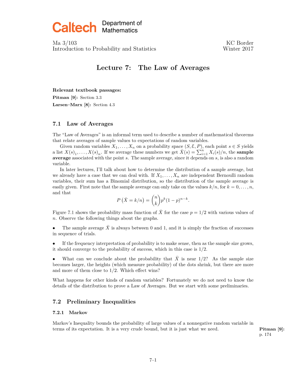 Department of Mathematics Ma 3/103 KC Border Introduction to Probability and Statistics Winter 2021 Lecture 7: Concentration Inequalities and the Law of Averages Relevant textbook passages: Pitman [19]: Section 3.3 Larsen–Marx [17]: Section 4.3 7.1 The Law of Averages The “Law of Averages” is an informal term used to describe a number of mathematical theorems that relate averages of sample values to expectations of random variables. F ∈ Given random variables X1,...,Xn on a probability space (Ω, ,PP), each point ω Ω yields ¯ n a list X(ω)1,...,X(ω)n. If we average these numbers we get X(ω) = i=1 Xi(ω)/n, the sample average associated with the outcome ω. The sample average, since it depends on ω, is also a random variable. In later lectures, I’ll talk about how to determine the distribution of a sample average, but we already have a case that we can deal with. If X1,...,Xn are independent Bernoulli random variables, their sum has a Binomial distribution, so the distribution of the sample average is easily given. First note that the sample average can only take on the values k/n, for k = 0, . , n, and that n P X¯ = k/n = pk(1 − p)n−k. k Figure 7.1 shows the probability mass function of X¯ for the case p = 1/2 with various values of n. Observe the following things about the graphs. • The sample average X¯ is always between 0 and 1, and it is simply the fraction of successes in sequence of trials. -