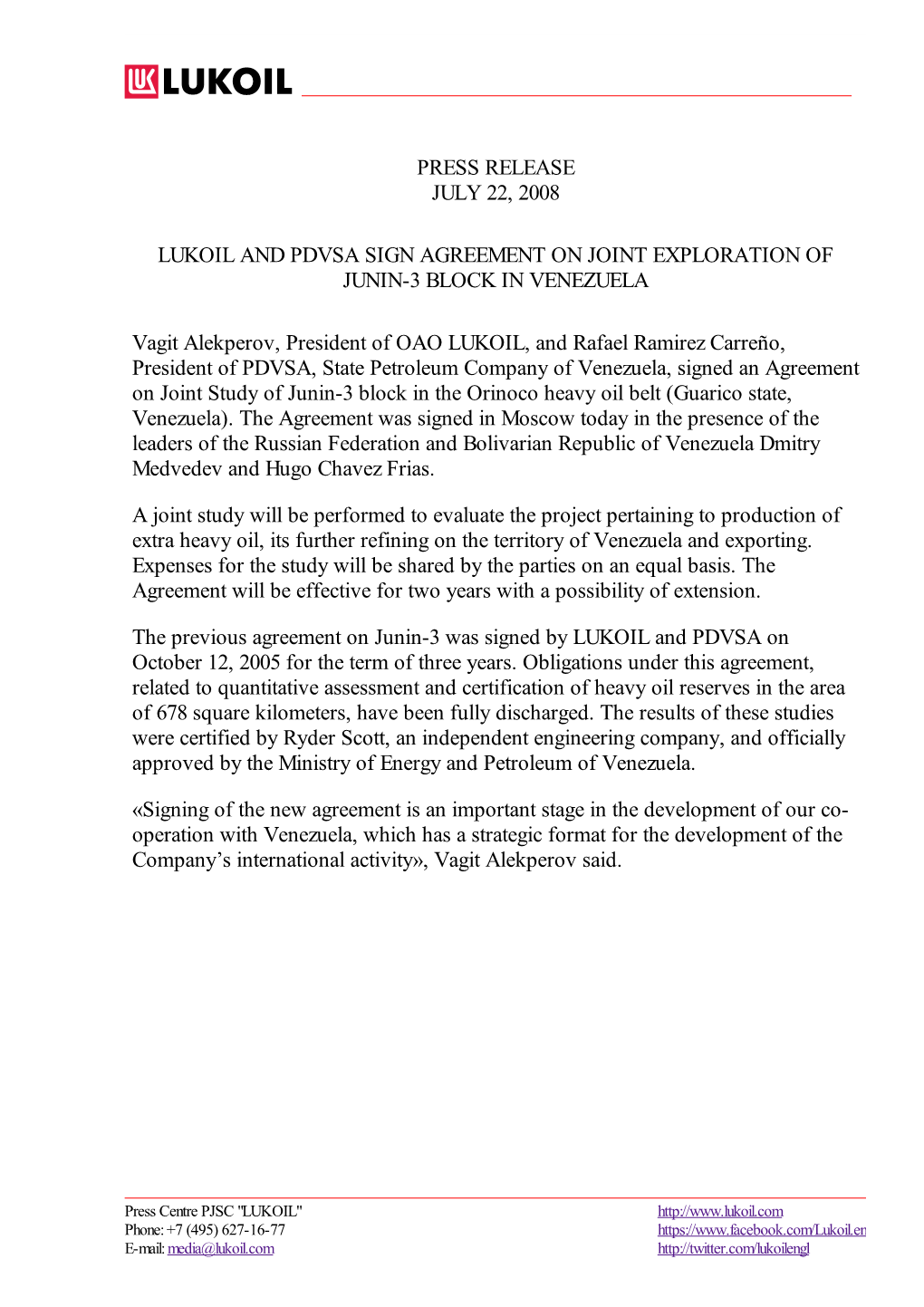 Press Release July 22, 2008 Lukoil and Pdvsa