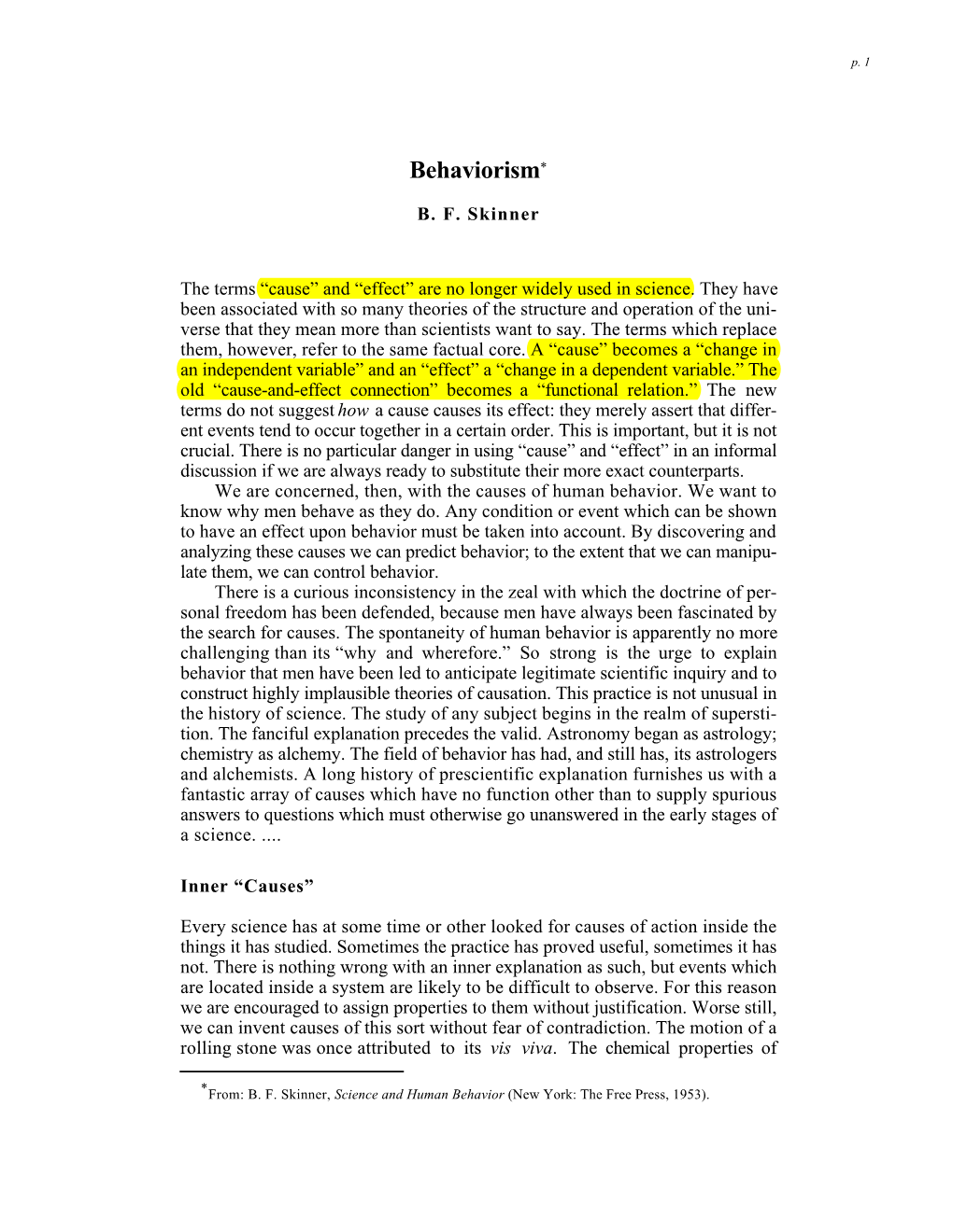 FROM MOSES AND MONOTHEISM TO BUDDHA AND BEHAVIORISM: COGNITIVE BEHAVIOR THERAPY’S TRANSPERSONAL CRISIS Douglas Y. Seiden, Ph.D. Kowloon Tong, Hong Kong KaNei Lam, Ph.D. Hung Hom, Hong Kong ABSTRACT: Philosophers of science in psychology have traditionally defined the field in such a way as to keep it distinct from inquiry into external referents of transpersonal experience. The cognitive behavioral mindfulness therapies (MTs) provide a forum for increased assimilation by the mainstream discipline of knowledge and skills drawn from the perennial psychologies and technologies of transcendence, and for accommodation of psychology’s own world hypotheses, root metaphors and truth criteria. The science-metaphysics debate in psychology is presented, including the pragmatism of William James, the radical behaviorism of B.F. Skinner, and the functional contextualism of Acceptance and Commitment Therapy. Classical and operant behavioral approaches to mysticism are explored, with a proposal for an integral behaviorism incorporating ‘‘putative events’’ associated with anomalous states. The authors recommend a Transpersonal Cognitive Behavior Therapy drawing from the full range of wisdom tradition teachings in a manner that is entheo-syntonic with a given client’s world view. Reality may be merely an inference and, according to some authorities, a bad one. What is important may not be the physical world on the far side of the skin but what that world means to us on this side. —B. F. Skinner (The steep and thorny way to a science of behavior, 1975, p. 43) With our thoughts we make the world. —S.G.Buddha(Byrom,Dhammapada: The sayings of the Buddha, 1976, p. -