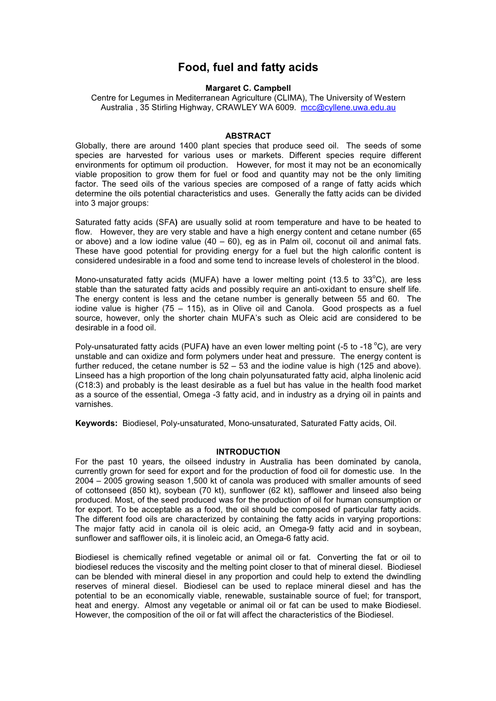 Chapter 5 Prospects and Potential of Green Fuel from some Non Traditional Seed Oils Used as Biodiesel Mushtaq Ahmad, Lee Keat Teong, Muhammad Zafar, Shazia Sultana, Haleema Sadia and Mir Ajab Khan Additional information is available at the end of the chapter http://dx.doi.org/10.5772/52031 1. Introduction Today’s diesel engines require a clean-burning, stable fuel that performs well under a variety of operating conditions. Biodiesel is the only alternative fuel that can be used directly in any existing, unmodified diesel engine. Because it has similar properties to petroleum diesel fuel, biodiesel can be blended in any ratio with petroleum diesel fuel. Many federal and state fleet vehicles in USA are already using biodiesel blends in their existing diesel engines (Harwood, 1981). The low emissions of biodiesel make it an ideal fuel for use in marine areas, national parks and forests, and heavily polluted cities. Biodiesel has many advantages as a transport fuel. For example, biodiesel can be produced from domestically grown oilseed plants. Producing biodiesel from domestic crops reduces the dependence on foreign petroleum, increases agricultural revenue, and creates jobs. Presently world’s energy needs are met through non-renewable resources such as petrochem‐ icals, natural gas and coal. Since the demand and cost of petroleum based fuel is growing rapidly, and if present pattern of consumption continues, these resources will be depleted in near future. It is the need of time to explore alternative sources of fuel energy. An alternative fuel must be technically feasible, economically competitive, environmentally acceptable and easily available. Fatty acid methyl esters derived from renewable sources such as vegetable oils has gained importance as an alternative fuel for diesel engines. -
