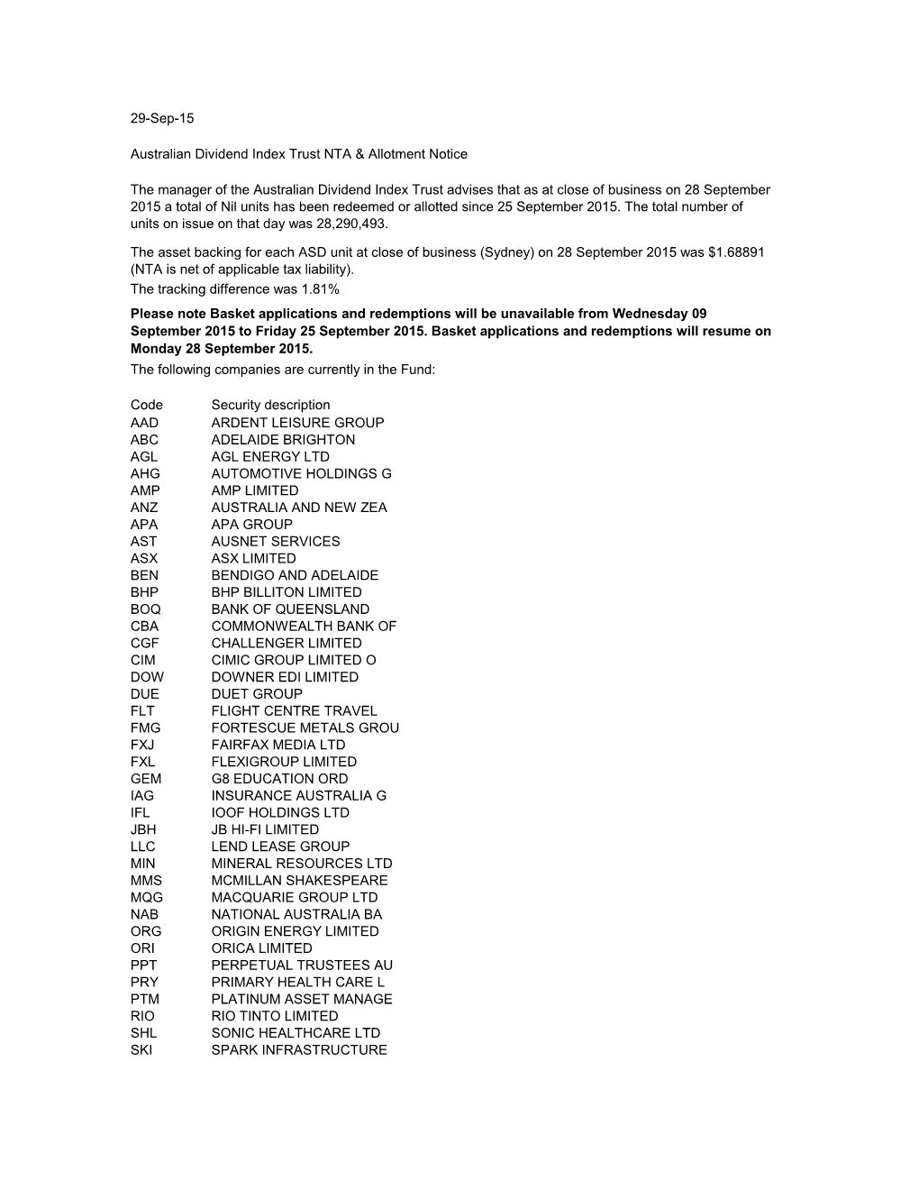 Code Security Description AAD ARDENT LEISURE GROUP ABC