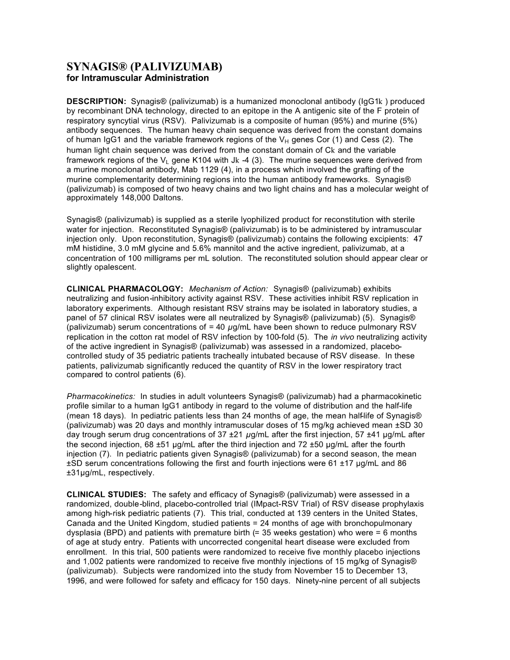 ANNEX I SUMMARY OF PRODUCT CHARACTERISTICS 1 1. NAME OF THE MEDICINAL PRODUCT Synagis 50 mg/0.5 ml solution for injection Synagis 100 mg/1 ml solution for injection 2. QUALITATIVE AND QUANTITATIVE COMPOSITION 1 ml of Synagis solution contains 100 mg of palivizumab*. Each 0.5 ml vial contains 50 mg of palivizumab. Each 1 ml vial contains 100 mg of palivizumab. *Palivizumab is a recombinant humanised monoclonal antibody produced by DNA technology in mouse myeloma host cells. For the full list of excipients, see section 6.1. 3. PHARMACEUTICAL FORM Solution for injection. The solution is clear or slightly opalescent. 4. CLINICAL PARTICULARS 4.1 Therapeutic indications Synagis is indicated for the prevention of serious lower respiratory tract disease requiring hospitalisation caused by respiratory syncytial virus (RSV) in children at high risk for RSV disease: Children born at 35 weeks of gestation or less and less than 6 months of age at the onset of the RSV season. Children less than 2 years of age and requiring treatment for bronchopulmonary dysplasia within the last 6 months. Children less than 2 years of age and with haemodynamically significant congenital heart disease. 4.2 Posology and method of administration Posology The recommended dose of palivizumab is 15 mg/kg of body weight, given once a month during anticipated periods of RSV risk in the community. The volume (expressed in ml) of // Palivizumab // to be administered at one-monthly intervals = [patient weight in kg] multiplied by 0.15. Where possible, the first dose should be administered prior to commencement of the RSV season. -