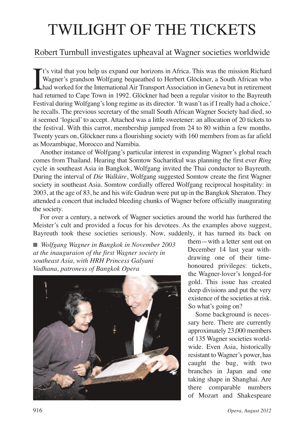 MY FIFTY YEARS WITH RICHARD WAGNER I don't for a moment profess to be an expert on the subject of the German composer Wilhelm Richard Wagner and have not made detailed comments on performances, leaving opinions to those far more enlightened than I. However having listened to Wagnerian works on radio and record from the late 1960s, and after a chance experience in 1973, I have been fascinated by the world and works of Wagner ever since. I have been fortunate to enjoy three separate cycles of Der Ring des Nibelungen, in Bayreuth 2008, San Francisco in 2011 and Melbourne in 2013 and will see a fourth, being the world's first fully digitally staged Ring cycle in Brisbane in 2020 under the auspices of Opera Australia. I also completed three years of the degree course in Architecture at the University of Quensland from 1962 and have always been interested in the monumental buildings of Europe, old and new, including the opera houses I have visited for performance of Wagner's works. It all started in earnest on September 29, 1973 when I was 28 yrs old, when, with friend and music mentor Harold King of ABC radio fame, together we attended the inaugural orchestral concert given at the Sydney Opera House, in which the legendary Swedish soprano Birgit Nilsson opened the world renowned building singing an all Wagner programme including the Immolation scene from Götterdämmerung, accompanied by the Sydney Symphony Orchestra conducted by a young Charles Mackerras. This event fully opened my eyes to the Ring Cycle - and I have managed to keep the historic souvenir programme. -