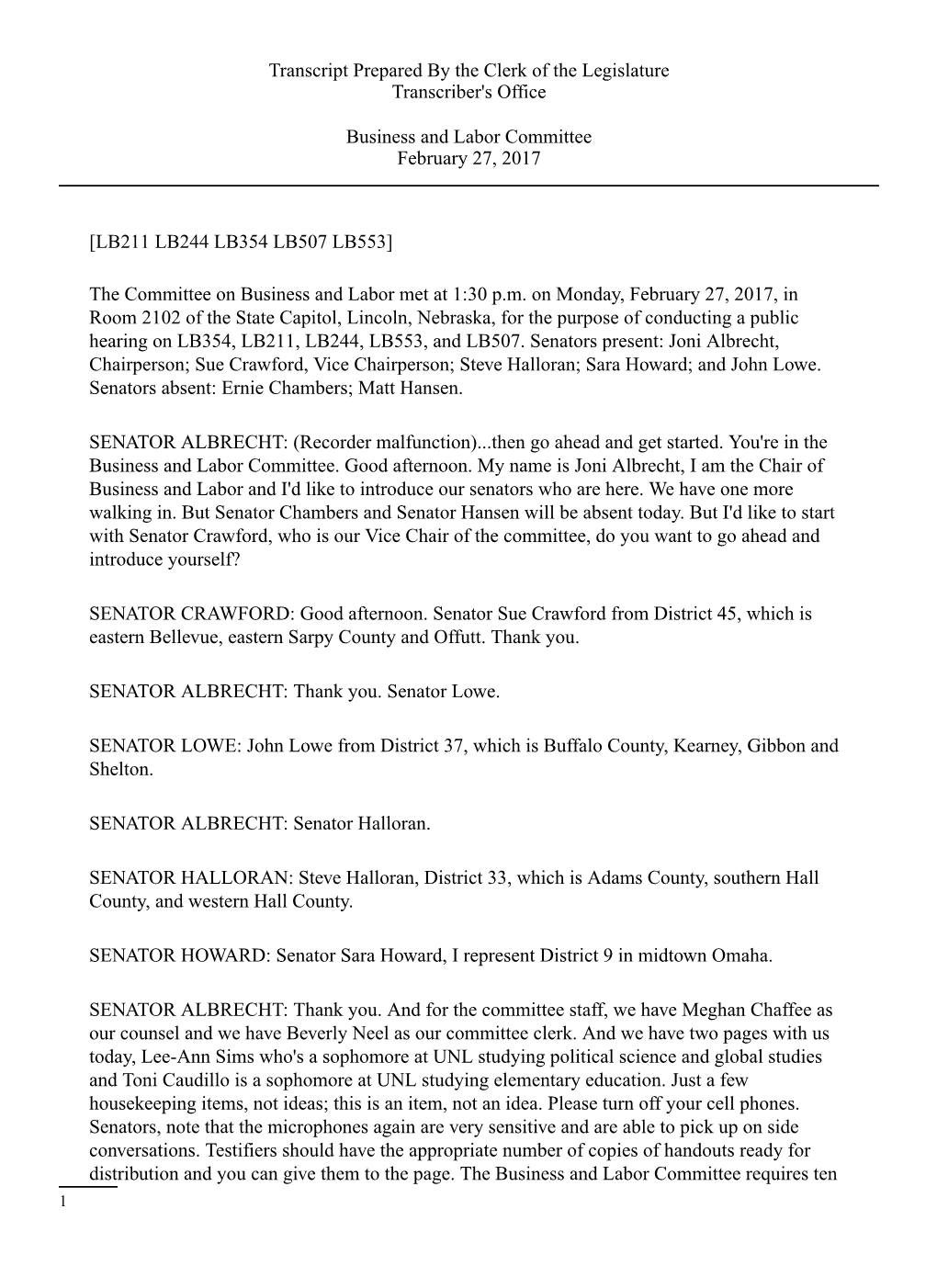 Transcript Prepared by Clerk of the Legislature Transcribers Office Government, Military and Veterans Affairs Committee January 27, 2021 Rough Draft Does not include written testimony submitted prior to the public hearing per our COVID-19 Response protocol BREWER: Good morning, welcome, welcome to the Government, Military and Veterans Affairs Committee. I am Senator Tom Brewer from Gordon, Nebraska, representing the 43rd Legislative District. I serve as the Chair of this committee. Because of the COVID situation, we're going to go through a number of COVID specific things and then we'll get into the Government Committee intro here. For the safety of our committee members, staff, pages, and the public, we ask those attending our hearing to abide by the following procedures. Due to social distancing requirements, seating in the hearing room is limited, very limited. We ask that you only enter the hearing room when it is necessary for you to attend your hearing. The bills will be taken up as posted outside the hearing on the wall. The list will be updated after each hearing to identify which bill is the current bill up, so the number will be up there and then the pages will then post outside. The committees will pause between each bill to allow enough time for the public to move in and move out. Keep in mind that after each testifier, we'll need a slight delay in order to clean the table, clean the chair. So just understand we'll have some pauses. But those pauses are not for senators to start talking because the mikes will be on and it will still be getting recorded. -