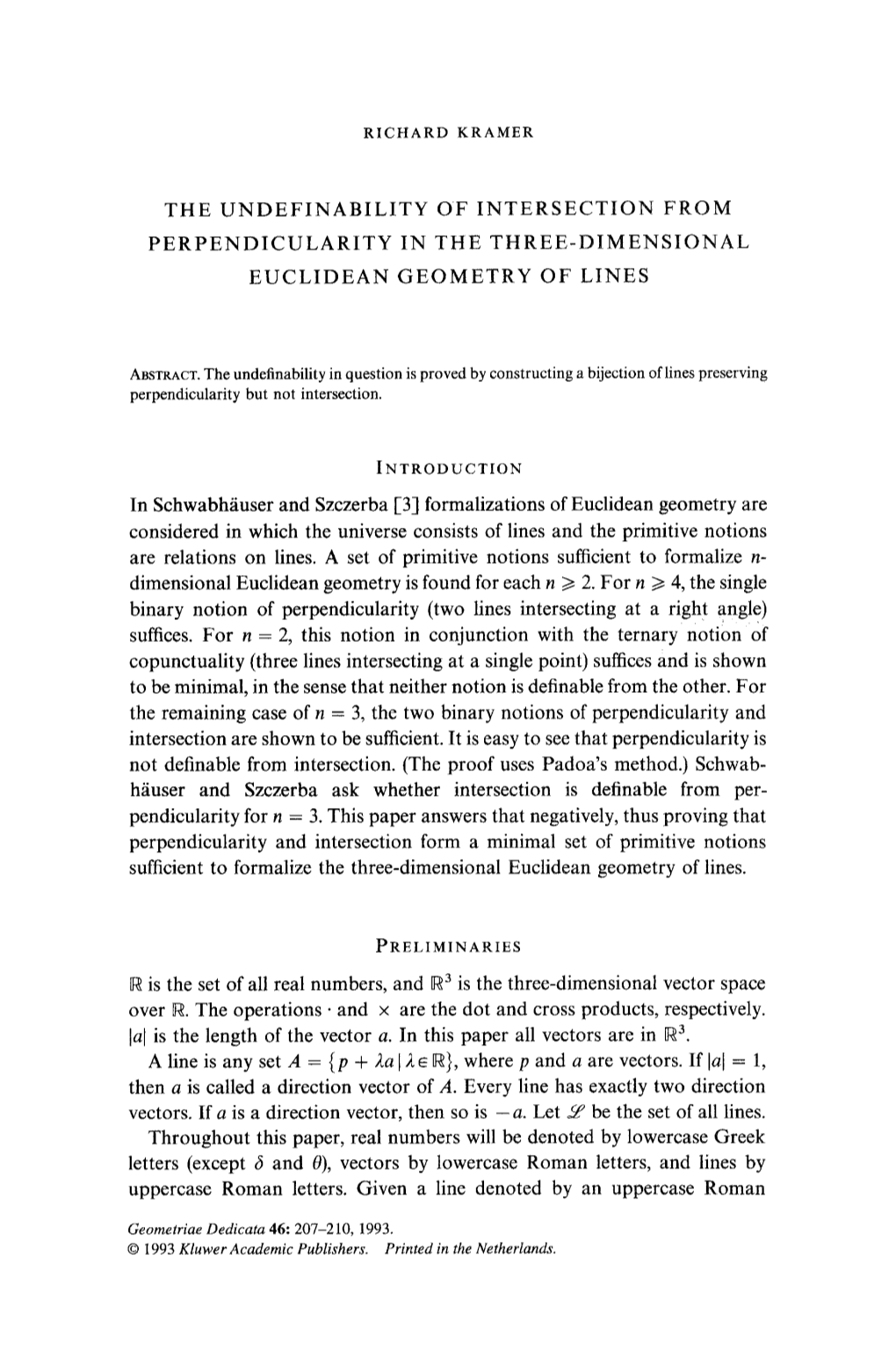 The Undefinability of Intersection from Perpendicularity in the Three-Dimensional Euclidean Geometry of Lines