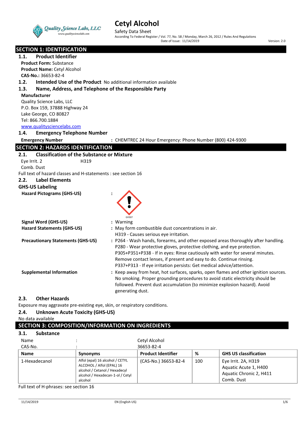 Cetyl Alcohol Safety Data Sheet According to Federal Register / Vol