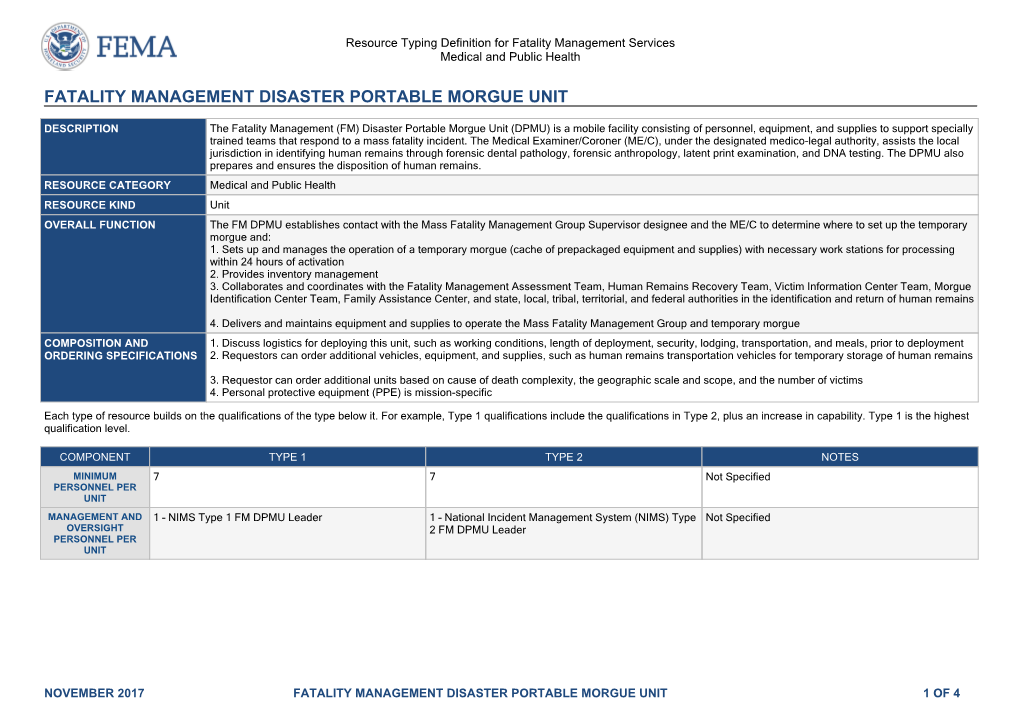 White Paper- Managing Mass Fatalities During a Pandemic Influenza Incident in the United States White Paper Morgue Operations, Identification, and Command and Control of Mass Fatalities resulting from a Pandemic Influenza Event in the United States Authored by: Devlin, S. (Fairfax Co, Police), Gavin, C, (Battelle- US Army ECBC-MIRP), Lyle, B (Orange County, CA Sheriff-Coroner), McGovern, J LTC (US Army North) Contributing Authors: Butcher, B (New York City, OCME), Fierro, M (VA State, OCME), Fitch, J (National Funeral Directors Association), Fudenberg, J (Clark County Office of the Coroner, Nevada), Gursky, E (ANSER-Biodefense), Kanis, P (US Red Cross), Roath, D (US Army ER) I Executive Summary The number of those estimated to perish during another pandemic influenza (PI) event in the United States (US) may be between 5%- 7% of the infected population (infected population est. to be 25%) or 3,612,500 – 5,057,500 respectively1. Governmental authorities, primarily the medical examiner/coroner (ME/C), law enforcement, public health, and associated death care professionals, will not only need to manage these fatalities but also the 2.4 million deaths that occur annually. The purpose of this paper, written at the behest of the US Northern Command’s Joint Task Force-Civil Support (JTF-CS), is to identify the predominant issues regarding command and control of mass fatalities, morgue operations, and body identification during a PI event and provide senior leaders actionable recommendations to managing this most daunting task. Subject matter experts identified eleven major issues senior leaders need to address to manage numerous fatalities resulting from a PI event. -