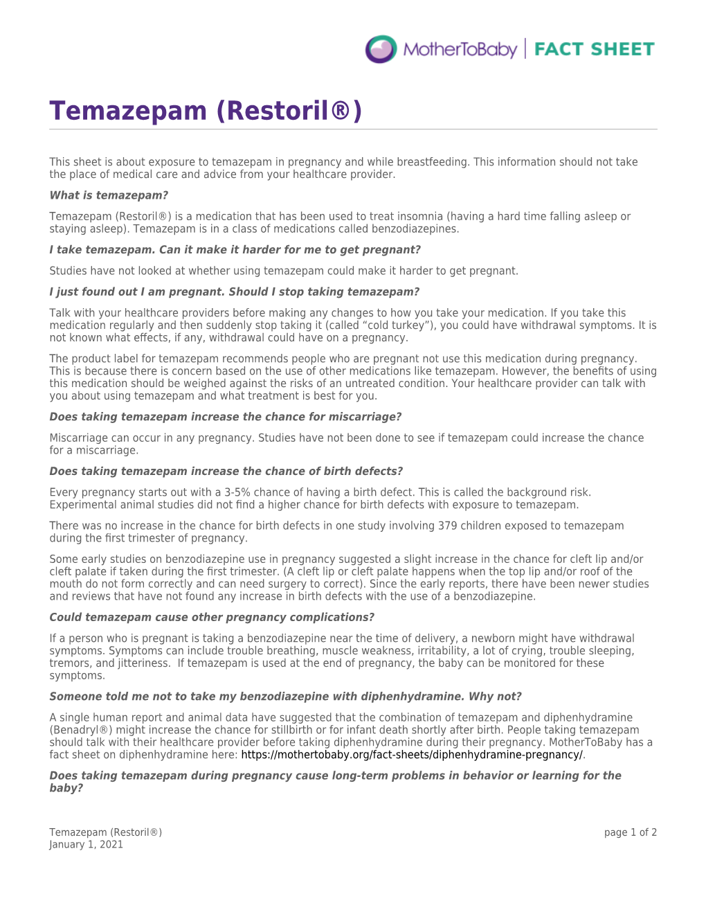 MEDICATION GUIDE RESTORIL™ (res-tə-ril) (temazepam) Capsules, C-IV What is the most important information I should know about RESTORIL? RESTORIL is a benzodiazepine medicine. Taking benzodiazepines with opioid medicines, alcohol, or other central nervous system depressants (including street drugs) can cause severe drowsiness, breathing problems (respiratory depression), coma and death. After taking RESTORIL, you may get up out of bed while not being fully awake and do an activity that you do not know you are doing. The next morning, you may not remember that you did anything during the night. You have a higher chance for doing these activities if you drink alcohol or take other medicines that make you sleepy with RESTORIL. Reported activities include: o driving a car (“sleep-driving”) o making and eating food o talking on the phone o having sex o sleep-walking Call your healthcare provider right away if you find out that you have done any of the above activities after taking RESTORIL. Do not take RESTORIL unless you are able to stay in bed a full night (7 to 8 hours) before you must be active again. Do not take more RESTORIL than prescribed. What is RESTORIL? RESTORIL is a prescription sleep medicine. RESTORIL is used in adults for the short-term (usually 7 to 10 days) treatment of a sleep problem called insomnia. Symptoms of insomnia include trouble falling asleep and waking up often during the night. RESTORIL is a federal controlled substance (C-IV) because it can be abused or lead to dependence. Keep RESTORIL in a safe place to prevent misuse and abuse. -