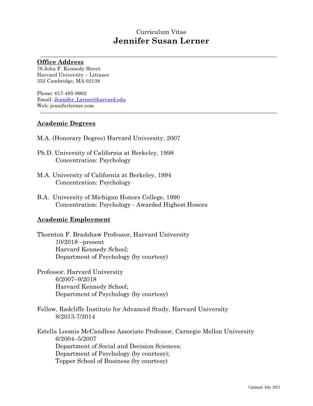 Curriculum Vitae Jennifer Susan Lerner