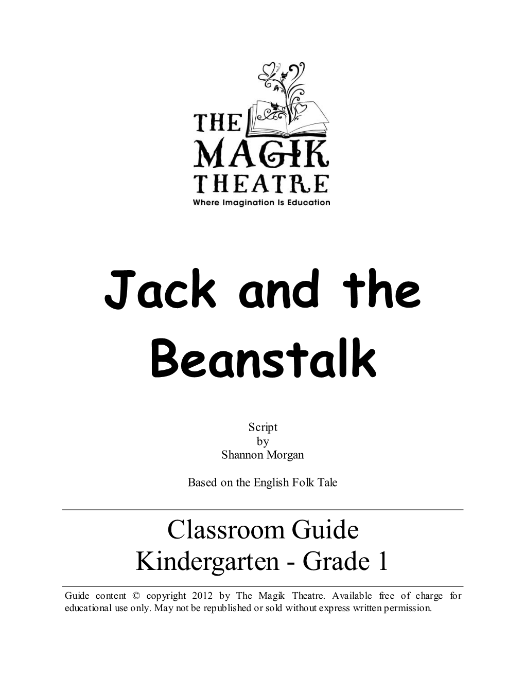 Jack and the Beanstalk Study Guide Objectives This study guide can be used before and/or after seeing the Jack and the Beanstalk puppet show at the Great Arizona Puppet Theater. Students will practice their compare and contrast skills as well as their critiquing skills. Students will also make their own mask and color pictures while reading through the story! This guide is good for parents and teachers alike. Please take or leave any parts of this study guide that will be good for your students or child. The puppet show and this study guide are best for Kindergarten age to grade 3: feel free to tailor the activities to your specific class or child's needs and grade level. Arizona State College & Career Ready Standards Reading Literature, Writing, and Speaking and Listening Standards: K.SL.2. Confirm understanding of a text read aloud or information presented orally or through other media by asking and answering questions about key details and requesting clarification if something is not understood. (Coloring pages, Post show discussion) 1.SL.2. Ask and answer questions about key details in a text read aloud or information presented orally or through other media. (Post show discussion) 2.SL.2. Recount or describe key ideas or details from a text read aloud or information presented orally or through other media. (Post show discussion) K.RL.3. With prompting and support, identify characters, settings, and major events in a story (Story review, Coloring pages, Post show discussion) 1.RL.3. Describe characters, settings, and major events in a story, using key details (Story review, Coloring pages, Post show discussion) 2.RL.3. -