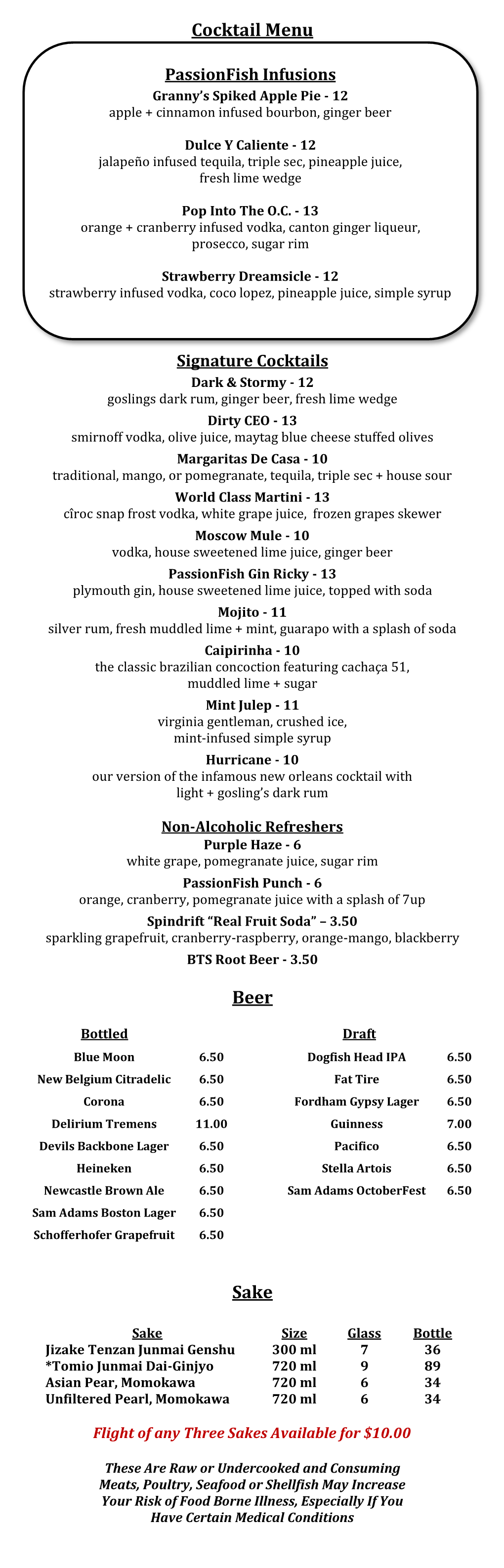 BEVERAGES ASSORTED JUICES 3.25 COCA COLA PRODUCTS 3.25 COFFEE & TEA 3.25 Orange Juice or Lemonade, Ocean Spray Coca Cola, Diet Coke, Cherry Coke, Sprite, Freshly Brewed Regular or Decaffeinated Pink Grapefruit or Cranberry, Campbell’s Fanta Birch Beer, Seagram’s Ginger Ale Coffee Iced or Assorted Hot Tea Tomato, Mott’s Apple, Dole Pineapple Juice COCKTAILS BAHAMA MAMA 9 MOJITO PICAROON PLUNDER 9 Light rum, gold rum, coconut rum, 10 Seasonal Coconut rum, vanilla vodka mixed with pineapple juice, & a dash of crème de Citrus rum, simple syrup, lime juice, mango, pineapple & orange juices coconut & Grenadine fresh mint & a splash of soda SUMMER DAYZ 10 MAITAI 9 BEACH BELLINI 10 Vodka, elderflower liqueur, lemonade, Gold rum, Amaretto, triple sec, Peach vodka, sparkling wine & peach grapefruit & sparkling wine pineapple juice, splash of Grenadine puree then topped w/ dark rum CARIBBEAN PAINKILLER 8 COCO CABANA 9 Gold rum, pineapple juice, oj, splashed TIDAL WAVE 9 A blend of spiced and coconut rums, with crème de coconut & topped with Gold rum, Amaretto, blue curacao, mixed with pineapple juice & crème de nutmeg pineapple juice & a splash of crème de coconut coconut MARGARITAS MARTINIS Dessert MARTINIS TRADITIONAL MARGARITA 9 PEACH MARTINI 12 ESPRESSO MARTINI 13 Tequila, triple sec, sour mix with a splash Vodka, peach schnapps & peach puree Triple shot espresso vodka, baileys & half of lime n half WATERMELON MARTINI 12 FLAVORED MARGARITA 9 Vodka, Midori & a splash of cranberry CHOCOLATE MARTINI 12 Add a strawberry, mango, pomegranate, juice -