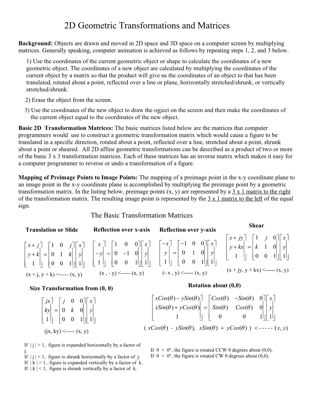 Two-Dimensional Geometric Transformations 1 Basic Two-Dimensional Geometric Transformations 2 Matrix Representations and Homogeneous Coordinates 3 Inverse Transformations 4 Two-Dimensional Composite Transformations 5 Other Two-Dimensional Transformations 6 Raster Methods for Geometric Transformations 7 OpenGL Raster Transformations 8 Transformations between Two-Dimensional Coordinate Systems 9 OpenGL Functions for Two-Dimensional Geometric Transformations 10 OpenGL Geometric-Transformation o far, we have seen how we can describe a scene in Programming Examples S 11 Summary terms of graphics primitives, such as line segments and fill areas, and the attributes associated with these primitives. Also, we have explored the scan-line algorithms for displaying output primitives on a raster device. Now, we take a look at transformation operations that we can apply to objects to reposition or resize them. These operations are also used in the viewing routines that convert a world-coordinate scene description to a display for an output device. In addition, they are used in a variety of other applications, such as computer-aided design (CAD) and computer animation. An architect, for example, creates a layout by arranging the orientation and size of the component parts of a design, and a computer animator develops a video sequence by moving the “camera” position or the objects in a scene along specified paths. Operations that are applied to the geometric description of an object to change its position, orientation, or size are called geometric transformations. Sometimes geometric transformations are also referred to as modeling transformations, but some graphics packages make a From Chapter 7 of Computer Graphics with OpenGL®, Fourth Edition, Donald Hearn, M. -