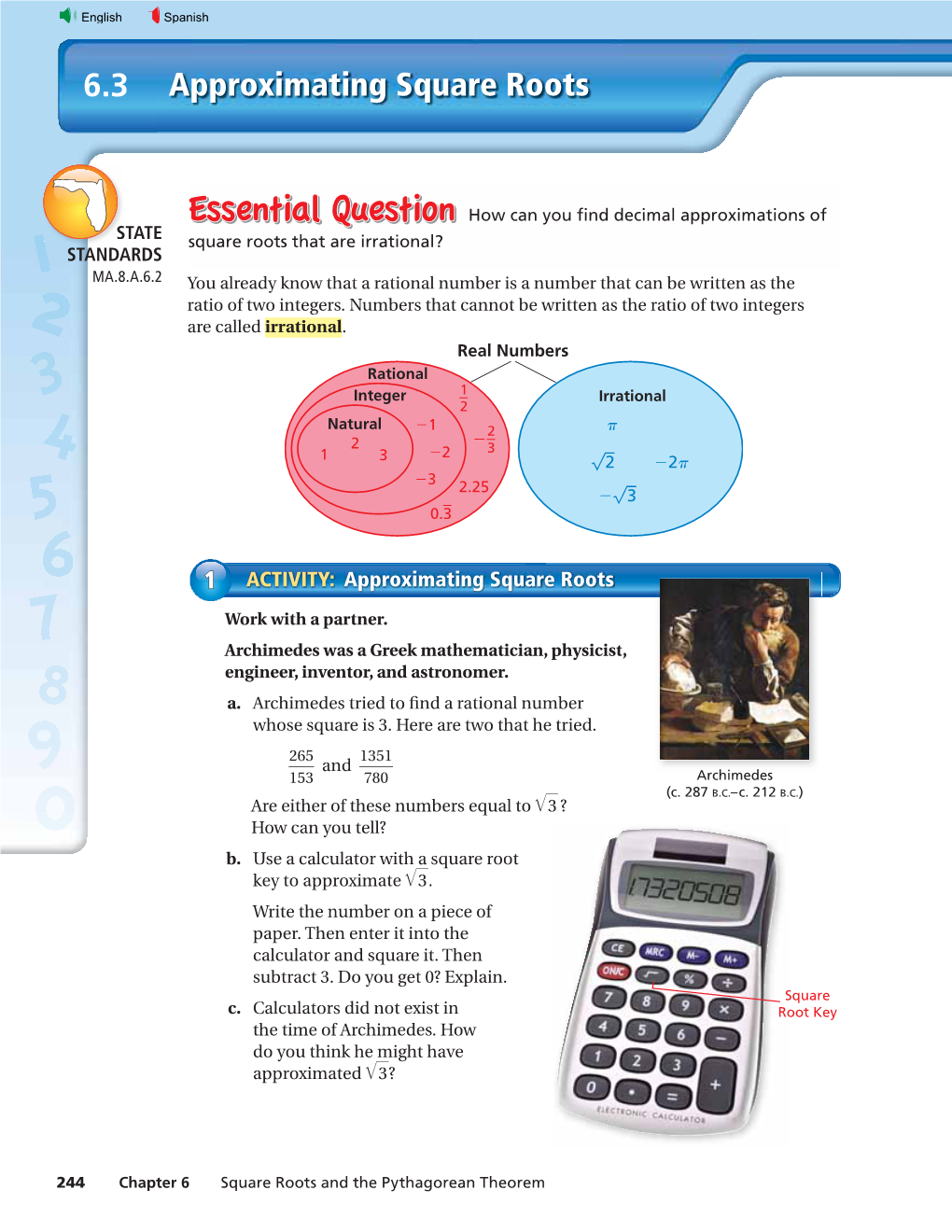 6.2 The Pythagorean Theorem How are the lengths of the sides of a right STATES triangle related? STANDARDS MA.8.G.2.4 MA.8.A.6.4 Pythagoras was a Greek mathematician and philosopher who discovered one of the most famous rules in mathematics. In mathematics, a rule is called a theorem. So, the rule that Pythagoras discovered is called the Pythagorean Theorem. Pythagoras (c. 570 B.C.–c. 490 B.C.) 1 ACTIVITY: Discovering the Pythagorean Theorem Work with a partner. a. On grid paper, draw any right triangle. Label the lengths of the two shorter sides (the legs) a and b. c2 c a a2 b. Label the length of the longest side (the hypotenuse) c. b b2 c . Draw squares along each of the three sides. Label the areas of the three squares a 2, b 2, and c 2. d. Cut out the three squares. Make eight copies of the right triangle and cut them out. a2 Arrange the fi gures to form 2 two identical larger squares. c b2 e. What does this tell you about the relationship among a 2, b 2, and c 2? 236 Chapter 6 Square Roots and the Pythagorean Theorem 2 ACTIVITY: Finding the Length of the Hypotenuse Work with a partner. Use the result of Activity 1 to fi nd the length of the hypotenuse of each right triangle. a. b. c 10 c 3 24 4 c. d. c 0.6 2 c 3 0.8 1 2 3 ACTIVITY: Finding the Length of a Leg Work with a partner. -