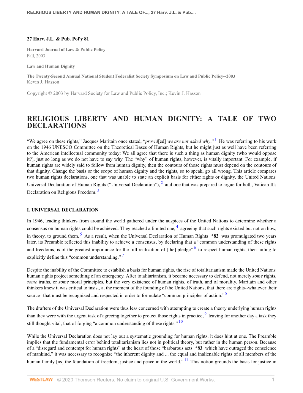 RELIGIOUS LIBERTY and HUMAN DIGNITY: a TALE OF..., 27 Harv