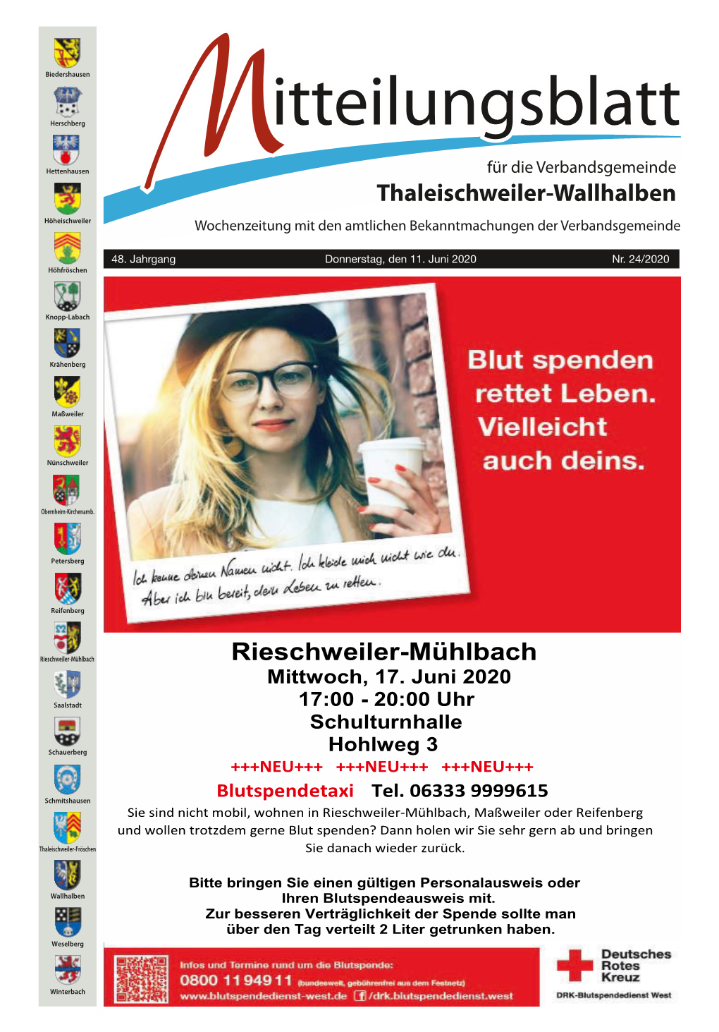 Biedershausen Herschberg itteilungsblatt Hettenhausen für die Verbandsgemeinde M Thaleischweiler-Wallhalben Höheischweiler Wochenzeitung mit den amtlichen Bekanntmachungen der Verbandsgemeinde 48. Jahrgang Donnerstag, den 26. März 2020 Nr. 13/2020 Höhfröschen Knopp-Labach Krähenberg Liebe Mitbürgerinnen und Mitbürger, Maßweiler die im Zuge der Ausbreitung des Coronavirus ergangenen Verfügungen werden von Nünschweiler den allermeisten Menschen in unserer Verbandsgemeinde eingehalten. Hierfür danke ich allen recht herzlich. Dennoch möchte ich Sie alle nochmals sensibilisieren. Obernheim-Kirchenarnb. Meine Familie pfegt freundschaftliche Beziehungen nach Bergamo / Italien. Bergamo liegt mitten im italienischen Krisengebiet. Unsere dortigen Freunde hatten meine Aufforderung in den sozialen Netzwerken gele- Petersberg sen, bei der ich darum warb, so weit wie möglich zu Hause zu bleiben. Sie haben auch gelesen, dass man für Eltern, Bekannte, Ältere Menschen usw. die Einkäufe erledigen möchte. Reifenberg Dies hat sie dazu veranlasst sich bei uns telefonisch zu melden. Die eindringliche Bot- schaft war: „Bleibt zu Hause, auch wenn es noch so schwerfällt, verzichtet auf den Besuch Rieschweiler-Mühlbach bei Verwandten, besonders auch bei Kindern, Enkeln, Eltern oder Großeltern. Wenn Einkäufe gemacht werden müssen, achtet auf die Einhaltung der Abstände, Saalstadt stellt Einkäufe an der Haustür ab! Wenn die Lawine rollt, hält sie niemand mehr auf, ihr in Deutschland könnt es noch steuern und abfedern.“ Schauerberg Soweit die Nachricht aus Bergamo. Was sich dort abspielt, kann sich bei uns wohl niemand vorstellen. Auch ich verzichte schweren Herzens auf diese Besuche. Liebe Mitbürgerinnen und Mitbürger, Schmitshausen ihre Gesundheit liegt mir, den Beigeordneten, uns allen in der kommunalen Familie und allen Mitarbeitern/innen der Verbandsgemeinde, am Herzen. Deshalb bitten wir ein- dringlich darum, die ergangenen Hinweise und Aufforderungen sehr ernst zu nehmen. -
