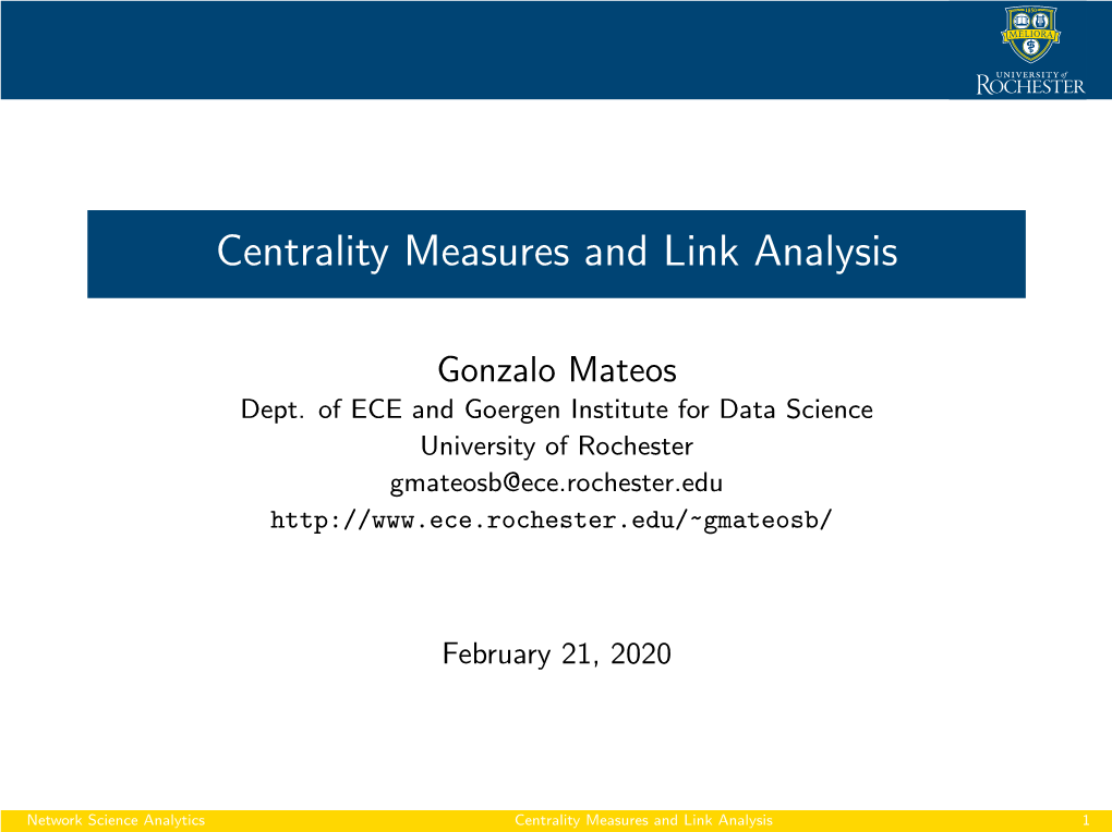 School of Information Sciences University of Pittsburgh TELCOM2125: Network Science and Analysis Konstantinos Pelechrinis Spring 2015 Figures are taken from: M.E.J. Newman, “Networks: An Introduction” CHAPTER 1 INTRODUCTION A short introduction to networks and why we study them A NETWORK is, in its simplest form, a collection of points joined together in pairs by lines. In the jargon of the field the points are referred to as vertices1 or nodes and the lines are referred to as What is a network?edges . Many objects of interest in the physical, biological, and social sciences can be thought of as networks and, as this book aims to show, thinking of them in this way can often lead to new and useful insights. We begin, in this introductory chapter, with a discussion of why we are interested in networks l A collection of pointsand joined a brief description together of some in specpairsific networks by lines of note. All the topics in this chapter are covered in greater depth elsewhere in the book. § Points that will be joined together depends on the context ü Points à Vertices, nodes, actors … ü Lines à Edges l There are many systems of interest that can be modeled as networks A small network composed of eight vertices and ten edges. § Individual parts linked in some way ü Internet o A collection of computers linked together by data connections ü Human societies o A collection of people linked by acquaintance or social interaction 2 Why are we interested in networks? l While the individual components of a system (e.g., computer machines, people etc.) as well as the nature of their interaction is important, of equal importance is the pattern of connections between these components § These patterns significantly affect the performance of the underlying system ü The patterns of connections in the Internet affect the routes packets travel through ü Patterns in a social network affect the way people obtain information, form opinions etc. -