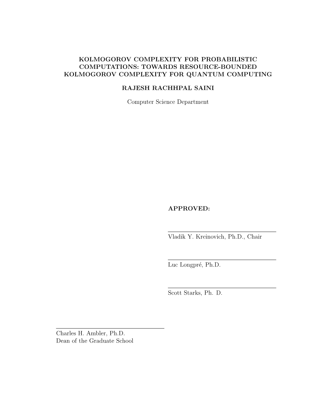 CHAPTER 4 Kolmogorov Complexity and its Applications Ming LI Aiken Computation Laboratory, Han•ard University, Cambridge, MA 02138, USA Paul M.B. VIT ANYI Centrum voor Wiskunde en biformatica, Kruislaan 413, 1098 SJ Amsterdam, Netherlands, and Facu/teit Wiskunde en Jnjormatica, Universiteic van Amsterdam, Amsterdam, Netherlands Contents L Introduction 189 2. Mathematical theory 196 3. Applications of compressibility 214 4. Example of an application in mathematics: weak prime number theorems. 221 5. Applications of incompressibility: proving lower bounds 222 6. Resource-bounded Kolmogorov complexity and its applications 236 7. Conclusion 247 Acknowledgment 247 References :48 HANDBOOK OF THEORETICAL COMPUTER SCIENCE Edited by J. van Leeuwen ((' Elsevier Science Publishers B.V., 1990 KOLMOGOROV COMPLEXITY AND ITS APPLICATIONS 189 t. Introduction In everyday language we identify the information in an individual object with the essentials of a description for it. We can formalize this by defining the amount of information in a finite object (like a string) as the size (i.e., number of bits) of the smallest program that, starting with a blank memory, outputs the string and then terminates. A similar definition can be given for infinite strings, but in this case the program produces element after element forever. Thus, 1n (a string of nones) contains little information because a program of size about log n outputs it (like "print n ls"). Likewise, the transcendental number rr = 3.1415 ... , an infinite sequence of seemingly "random" decimal digits, contains O(l) information. (There is a short program that produces the consecutive digits of rr forever.) Such a definition would appear to make the amount of information in a string depend on the particular programming language used. -