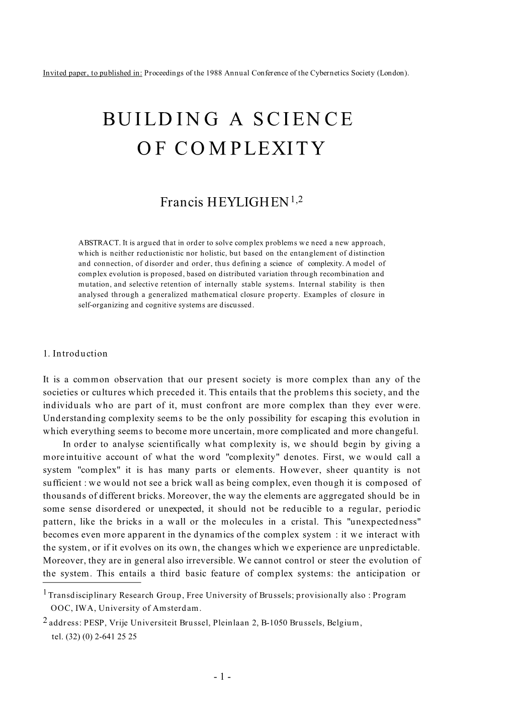 Heylighen F. (1990): "A New Transdisciplinary Paradigm for the Study of Complex Systems?", in: Self-Steering and Cognition in Complex Systems, Heylighen F., Rosseel E. & Demeyere F. (ed.), (Gordon and Breach, New York), p. 1-16. A NEW TRANSDISCIPLINARY PARADIGM FOR THE STUDY OF COMPLEX SYSTEMS? Francis Heylighen Transdisciplinary Research Group Free University of Brussels ABSTRACT: two paradigms for studying the relation between autonomy and cognition are reviewed and contrasted: the "artificial" paradigm, which sees autonomous systems as linear, information-processing organizations, and the "autopoietic" paradigm, which sees them as circular, self-producing organizations. It is argued that these two paradigms are not inconsistent but complementary, and that they can be synthesized in an encompassing paradigm based on the self-organization of complex systems through variation-and-selective retention, leading to the emergence of relatively autonomous subsystems. Some implications of such an encompassing paradigm on the level of science, technology, individual persons and society are outlined, with reference to the papers in this collection. It is argued that the further development of such a transdisciplinary approach will lead to a new "science of complexity". 1. Introduction In the preface to this book it was argued that some recent trends in different disciplines seem to converge around the concepts of self-organization, autonomy and cognition. Whether these developments really announce the emergence of a new paradigm remains to be proven. Only time can tell. In this position paper, I will assume that they do, and investigate where this new paradigm would be coming from, and where it might be heading to. -