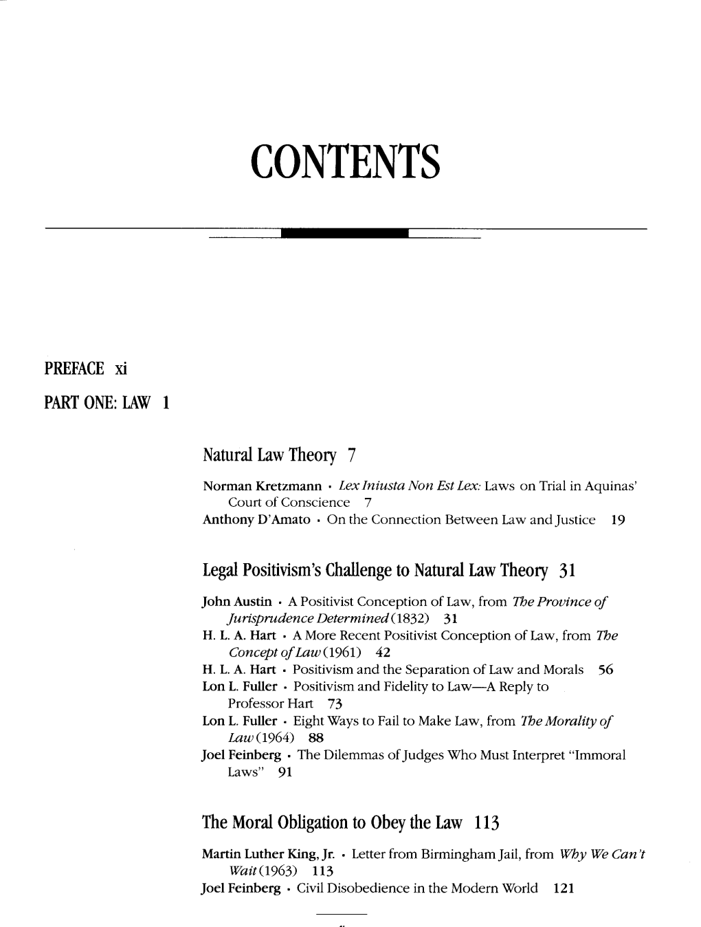 PHILOSOPHY OF LAW Seventh Edition Edited by Joel Feinberg University of Arizona Jules Coleman Yale Law School THOMSON WADSWORTH Australia • Canada • Mexico • Singapore • Spain < s» United Kingdom • United States CONTENTS PREFACE ix PART ONE: THE NATURE OF LAW 1 The Natural Law Tradition 8 Brian Bix, "Natural Law Theory" 8 Lon L. Füller, "Eight Ways to Fail to Make Law" 20 Positivism and Its Critics 24 John Austin, "A Positivist Conception of Law" 24 H. L. A. Hart, "A More Recent Positivist Conception of Law" 36 H. L. A. Hart, "Positivism and the Separation of Law and Morals" 50 Lon L. Füller, "Positivism and Fidelity to Law— A Reply to Professor Hart" 67 Ronald M. Dworkin, "The Model of Rules" 82 Riggs v. Palmer 100 Jules L. Coleman and Brian Leiter, "Legal Positivism" 105 Law From the Perspective of the Judge 119 O. W. Holmes, Jr., "The Path of the Law" 119 Jerome Frank, "Legal Realism" 125 Ronald Dworkin, "Integrity in Law" 127 Lon L. Füller, "The Case of the Speluncean Explorers" 142 John Hart Ely, "Discovering Fundamental Values" 157 David Lyons, "Constitutional Interpretation and Original Meaning" 172 Antonin Scalia, "Common-Law Courts in a Civil-Law System: The Role of United States Federal Courts in Interpreting the Constitution and Laws" 187 Ronald Dworkin, "Comment" 196 CONTENTS The Moral Obligation to Obey the Law 204 Plato, Crito 204 Martin Luther King, Jr., "Letter from Birmingham Jail" 213 M. B. E. Smith, "Is There a Prima Facie Obligation to Obey the Law?" 221 Scott J. Shapiro, "Authority" 236 PART TWO: JUSTICE 258 Liberty 267 John Stuart Mill, "On Liberty" 267 Joel Feinberg, "Offensive Nuisances" 278 Gerald Dworkin, "Paternalism" 293 Rights 304 Joel Feinberg, "The Nature and Value of Rights" 304 F. -