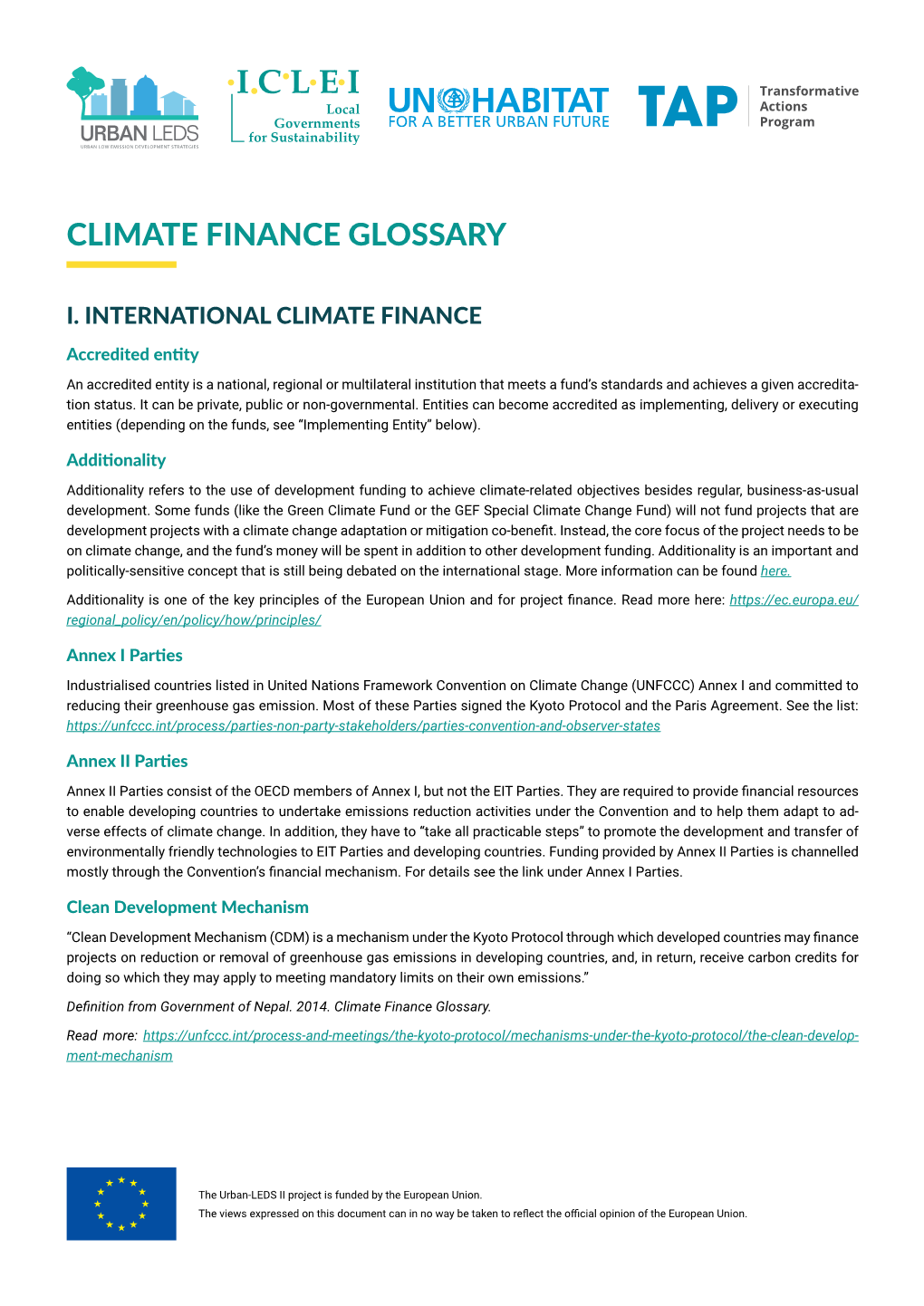 Common Principles for Climate Mitigation Finance Tracking Version 2 – 15th June 2015 Introduction The purpose of these Common Principles for Climate Mitigation Finance Tracking (or the Principles) is to set out agreed climate change mitigation finance tracking principles for development finance. The Principles have been developed by the joint climate finance group of multilateral development banks (MDBs)1 and the International Development Finance Club (IDFC)2 based on their experience on the topic and with the intention to be shared with other institutions that are looking for common approaches for tracking and reporting. The principles consist of a set of common Definitions and Guidelines including the list of activities, but do not cover aspects related to their implementation, including quality control procedures which remain the sole responsibility of each institution and/or group. The Principles reflect the approach that both groups (MDBs and IDFC) have been following for tracking climate change mitigation activities for the past 4 years, and are based on the application of harmonized terms. Purpose The MDBs and the IDFC commit to the Principles in their respective, group-based climate mitigation finance reporting. MDBs and IDFC invite other institutions to adopt the Principles and therewith further increase transparency and credibility of mitigation finance reporting. As an inherent and important part of improving mitigation climate finance tracking, the Principles will be subject to further revision by MDBs and IDFC jointly, based on amassed experience, and also, as a future step, should address comparability of reporting processes. In this respect, MDBs and IDFC are committed to maintaining an open and transparent exchange of information around institutional experience and learning, as well as to jointly discuss potential proposals to improve the Principles. -