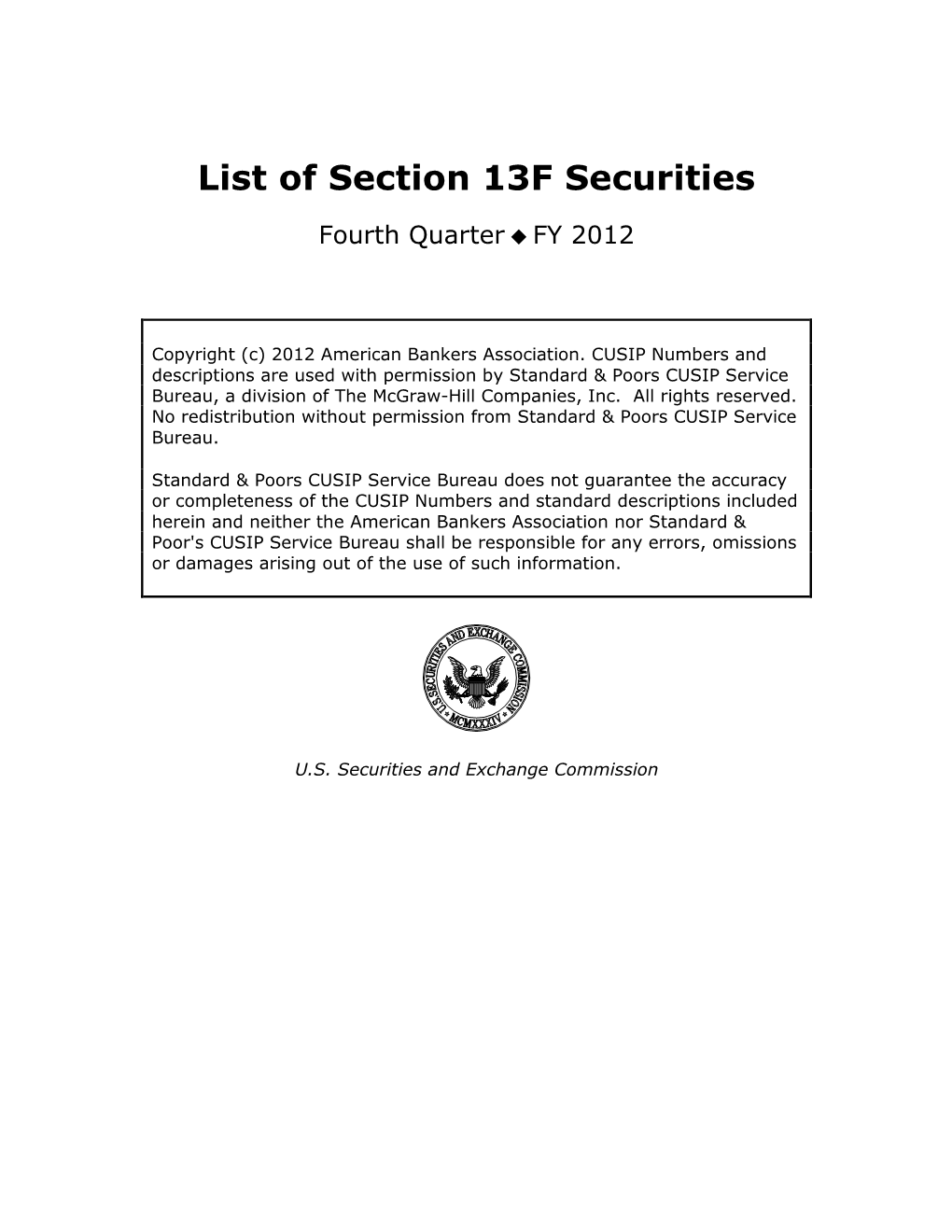 List of Section 13F Securities 1st Quarter FY 2004 Copyright (c) 2004 American Bankers Association. CUSIP Numbers and descriptions are used with permission by Standard & Poors CUSIP Service Bureau, a division of The McGraw-Hill Companies, Inc. All rights reserved. No redistribution without permission from Standard & Poors CUSIP Service Bureau. Standard & Poors CUSIP Service Bureau does not guarantee the accuracy or completeness of the CUSIP Numbers and standard descriptions included herein and neither the American Bankers Association nor Standard & Poor's CUSIP Service Bureau shall be responsible for any errors, omissions or damages arising out of the use of such information. U.S. Securities and Exchange Commission OFFICIAL LIST OF SECTION 13(f) SECURITIES USER INFORMATION SHEET General This list of “Section 13(f) securities” as defined by Rule 13f-1(c) [17 CFR 240.13f-1(c)] is made available to the public pursuant to Section13 (f) (3) of the Securities Exchange Act of 1934 [15 USC 78m(f) (3)]. It is made available for use in the preparation of reports filed with the Securities and Exhange Commission pursuant to Rule 13f-1 [17 CFR 240.13f-1] under Section 13(f) of the Securities Exchange Act of 1934. An updated list is published on a quarterly basis. This list is current as of March 15, 2004, and may be relied on by institutional investment managers filing Form 13F reports for the calendar quarter ending March 31, 2004. Institutional investment managers should report holdings--number of shares and fair market value--as of the last day of the calendar quarter as required by Section 13(f)(1) and Rule 13f-1 thereunder. -