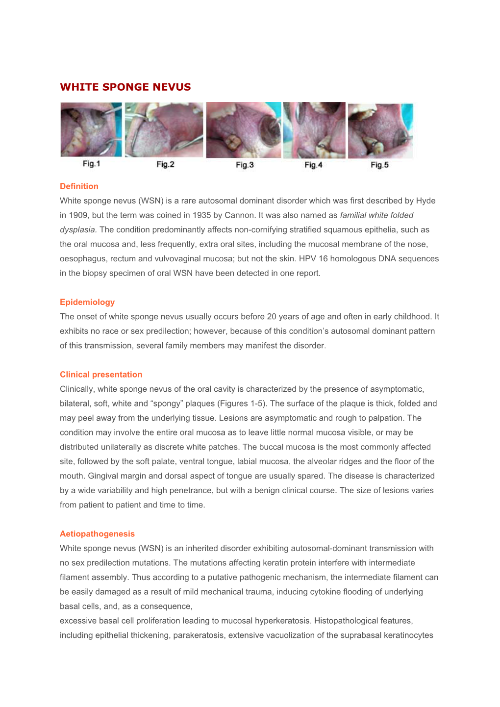 The Internet Journal of Advanced Nursing Practice ISPUB.COM Volume 4 Number 2 Perianal White Sponge Nevus In A Hispanic Female: A Case Study N Busen, M Tompkins Citation N Busen, M Tompkins. Perianal White Sponge Nevus In A Hispanic Female: A Case Study. The Internet Journal of Advanced Nursing Practice. 1999 Volume 4 Number 2. DOI: 10.5580/6c5 Abstract This article presents a case history of white sponge nevus (WSN) in the perianal area of a 23-year-old Hispanic female. WSN is a rare, autosomal dominant disorder that affects the noncornified stratified squamous epithelia. Clinically, the lesions are characterized by the presence of white, spongy plaques in the oral cavity. Extraoral lesions are found in other mucosal sites but are relatively uncommon in the absence of oral manifestations. Because WSN is rare, the differential diagnosis of this lesion may be difficult and the diagnosis is best made by a tissue biopsy performed in the context of a detailed patient and family history. The problems associated with differential diagnosis are addressed. INTRODUCTION was successfully treated for chlamydia in 1994 and has had Diagnosing lesions in the genital area by appearance can no other sexually transmitted diseases. She started sometimes prove elusive as illustrated by the case of a 23- menstruating at age 12 and became sexually active in her year-old Hispanic female who presented to an urban college late teens. She has been taking oral contraceptive pills health clinic with a long-standing complaint of a pruritic, (OCPs) intermittently for the past 5 years when sexually white lesion in the anogenital area. -