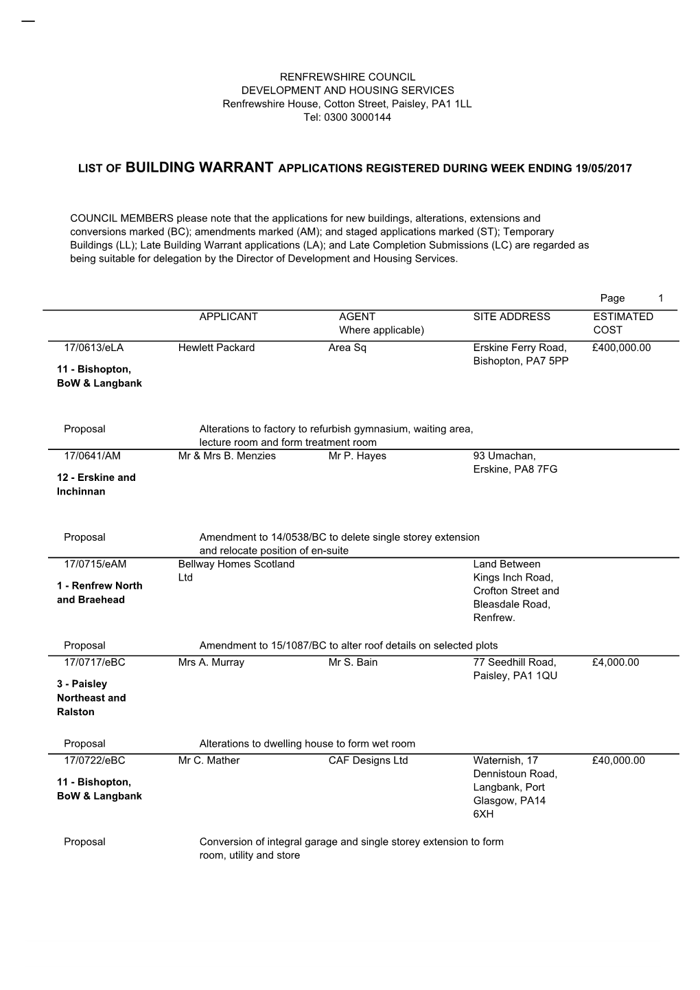 List of Building Warrant Applications Registered During Week Ending 19/05/2017