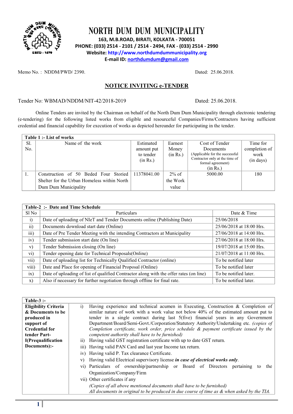 NORTH DUM DUM MUNICIPALITY 163, M. B. ROAD, BIRATI, KOLKATA - 700051 (033) 2514-2101 / 2514 - 2494, FAX-(033) 2514-2990 Website: http://www.northdumdummunicipality.org E-mail ID: [email protected] Memo No. NDDM/PH/749 Date: 14.02.2019 TENDER NOTICE Sealed Tenders are hereby invited for the following furniture from reputed suppliers or manufacturers having sufficient experience and credential for similar nature of work preferably in a Government Department. Similar nature means supply, installation and commissioning of office furniture and its accessories at UPHC 4, Nilachal, Ward No 33. Terms & Conditions 1) An earnest money of Rs 2,000/- (Rupees two thousand only) will have to be submitted in favour of Chairman, North Dum Dum Municipality in Bank Draft which is refundable to the unsuccessful tenderers. 2) Valid Income Tax return receipt, PAN Card, GST Certificate and valid trade license must be enclosed along with Tender papers. Credential Paper, if any must be enclosed. 3) Rate must be inclusive of all taxes, delivery charges and installation. 4) The supply is to be completed within 30 (thirty) days after getting the order. Time is to be treated as essence of the Contract. 5) The municipal authority is not bound to accept the lowest rate and reserve the right to reject the offer without assigning any reason. 6) Tender should be submitted within 10 (ten) days from the date of publication of this notice in the newspaper. 7) Tender paper should be purchased from Office of the Chairman, North Dum Dum Municipality on payment of Rs 1,000/- (Rupees one thousand only). -