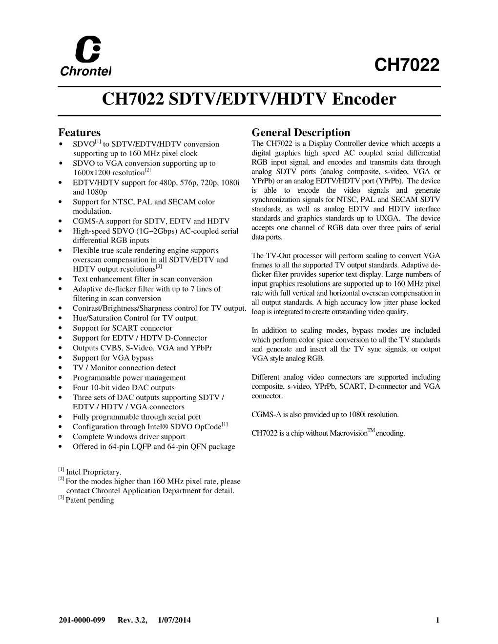 Chrontel CH7022 SDTV/EDTV/HDTV Encoder