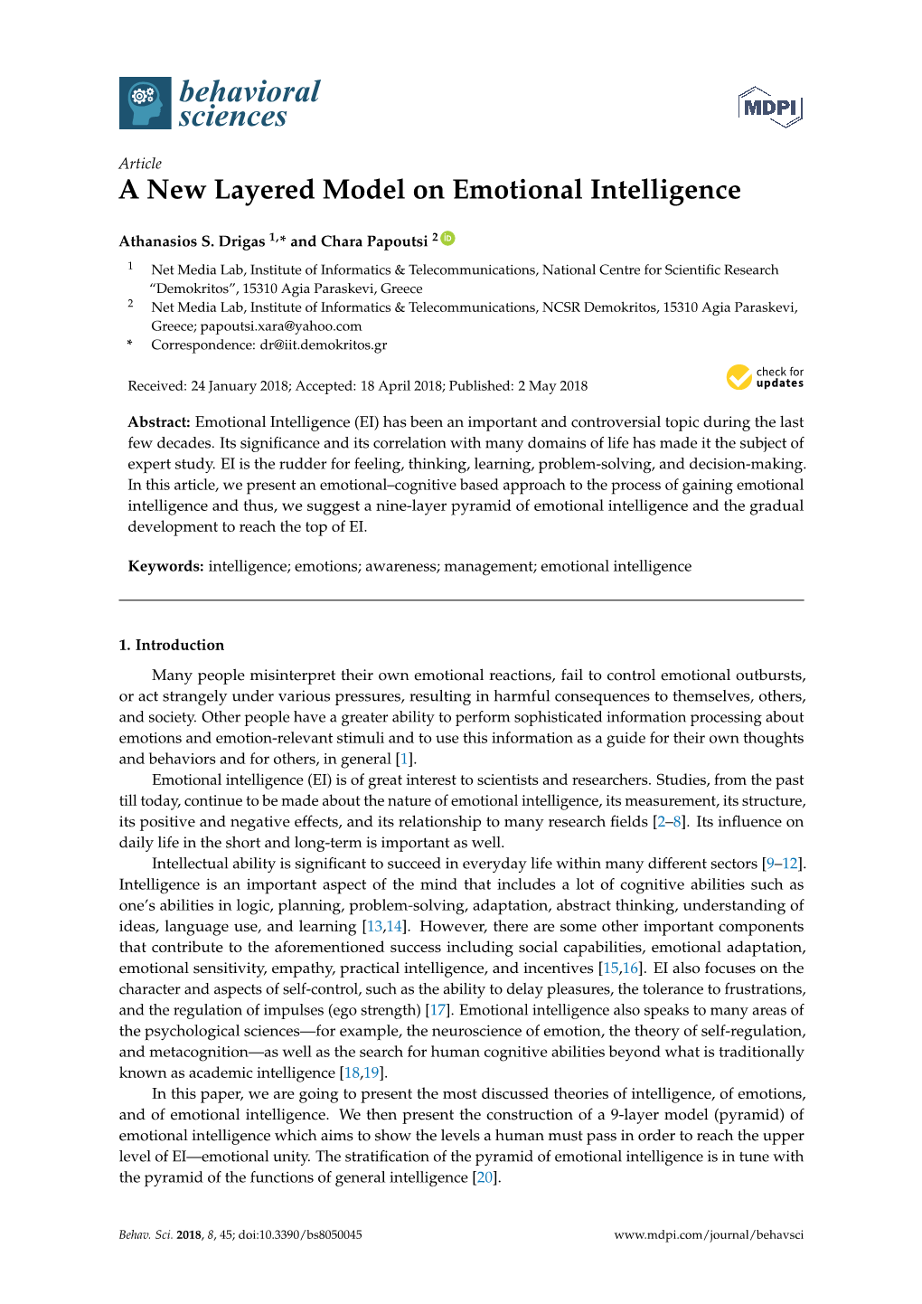 Journal of Intelligence Article How Multidimensional Is Emotional Intelligence? Bifactor Modeling of Global and Broad Emotional Abilities of the Geneva Emotional Competence Test Daniel V. Simonet 1,*, Katherine E. Miller 2 , Kevin L. Askew 1, Kenneth E. Sumner 1, Marcello Mortillaro 3 and Katja Schlegel 4 1 Department of Psychology, Montclair State University, Montclair, NJ 07043, USA; [email protected] (K.L.A.); [email protected] (K.E.S.) 2 Mental Illness Research, Education and Clinical Center, Corporal Michael J. Crescenz VA Medical Center, Philadelphia, PA 19104, USA; [email protected] 3 Swiss Center for Affective Sciences, University of Geneva, 1205 Geneva, Switzerland; [email protected] 4 Institute of Psychology, University of Bern, 3012 Bern, Switzerland; [email protected] * Correspondence: [email protected] Abstract: Drawing upon multidimensional theories of intelligence, the current paper evaluates if the Geneva Emotional Competence Test (GECo) fits within a higher-order intelligence space and if emotional intelligence (EI) branches predict distinct criteria related to adjustment and motivation. Using a combination of classical and S-1 bifactor models, we find that (a) a first-order oblique and bifactor model provide excellent and comparably fitting representation of an EI structure with self-regulatory skills operating independent of general ability, (b) residualized EI abilities uniquely Citation: Simonet, Daniel V., predict criteria over general cognitive ability as referenced by fluid intelligence, and (c) emotion Katherine E. Miller, Kevin L. Askew, recognition and regulation incrementally predict grade point average (GPA) and affective engagement Kenneth E. Sumner, Marcello Mortillaro, and Katja Schlegel. 2021. in opposing directions, after controlling for fluid general ability and the Big Five personality traits. -
