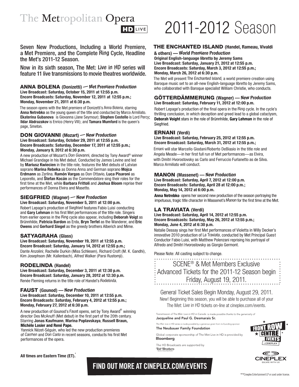 2011-12 Schedule of Live in HD transmissions October 15 at 1 PM EDT / 6 PM BST / 7 PM CEST / 8 PM EEST ANNA BOLENA (Donizetti) – Met Premiere Production Marco Armiliato; Anna Netrebko (Anna Bolena), Ekaterina Gubanova (Giovanna Seymour), Tamara Mumford (Smeton), Stephen Costello (Lord Riccardo Percy), Ildar Abdrazakov (Enrico VIII) David McVicar (Production); Robert Jones (Set Designer); Jenny Tiramani (Costume Designer); Paule Constable (Lighting Designer); Andrew George (Choreographer) October 29 at 1 PM EDT / 6 PM BST / 7 PM CEST / 8 PM EEST DON GIOVANNI (Mozart) – New Production James Levine; Marina Rebeka (Donna Anna), Barbara Frittoli (Donna Elvira), Mojca Erdmann (Zerlina), Ramón Vargas (Don Ottavio), Mariusz Kwiecien (Don Giovanni), Luca Pisaroni (Leporello), Joshua Bloom (Masetto), Štefan Kocán (The Commendatore) Michael Grandage (Production); Christopher Oram (Set & Costume Designer); Paule Constable (Lighting Designer); Ben Wright (Choreographer) November 5 at 12 PM EDT / 4 PM GMT / 5 PM CET / 6 PM EET SIEGFRIED (Wagner) – New Production James Levine; Deborah Voigt (Brünnhilde), Patricia Bardon (Erda), Gary Lehman (Siegfried), Gerhard Siegel (Mime), Bryn Terfel (Wanderer), Eric Owens (Alberich) Robert Lepage (Production); Neilson Vignola (Assistant Director); Carl Fillion (Set Designer); François St-Aubin (Costume Designer); Étienne Boucher (Lighting Designer); Pedro Pires (Video Image Artist) November 19 at 1 PM EST / 6 PM GMT / 7 PM CET / 8 PM EET SATYAGRAHA (Glass) Dante Anzolini; Rachelle Durkin (Miss Schlesen), Richard