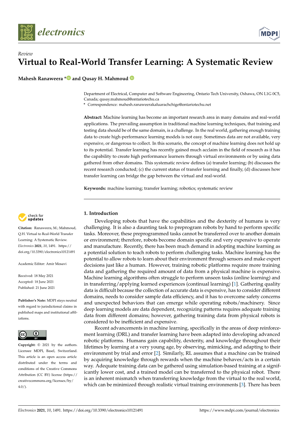 Virtual to Real-World Transfer Learning: a Systematic Review