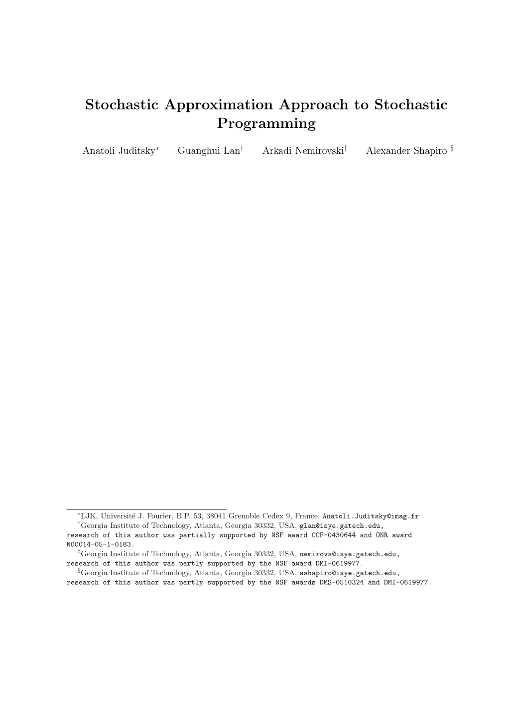 1 Multidimensional Stochastic Approximation: Adaptive Algorithms and Applications Mark Broadie, Columbia University Deniz M. Cicek, Columbia University Assaf Zeevi, Columbia University We consider prototypical sequential stochastic optimization methods of Robbins-Monro (RM), Kiefer- Wolfowitz (KW) and simultaneous perturbations stochastic approximation (SPSA) varieties and propose adaptive modifications for multidimensional applications. These adaptive versions dynamically scale and shift the tuning sequences to better match the characteristics of the unknown underlying function, as well as the noise level. We test our algorithms on a variety of representative applications in inventory manage- ment, health care, revenue management, supply chain management, financial engineering and queueing theory. ACM Reference Format: Mark Broadie, Deniz M. Cicek, and Assaf Zeevi, 2013. Multidimensional Stochastic Approximation: Adap- tive Algorithms and Applications ACM Trans. Embedd. Comput. Syst. 1, 1, Article 1 (January 2014), 28 pages. DOI:http://dx.doi.org/10.1145/0000000.0000000 1. INTRODUCTION 1.1. Background and overview of main contributions Stochastic approximation is an iterative procedure which can be used to estimate the root of a function or the point of optimum, where the function values cannot be calcu- lated exactly. This can happen, for example, when function values are estimated from noisy samples in a Monte Carlo simulation procedure. The first type of stochastic approximation algorithm dates back to the work of [Rob- bins and Monro 1951] and focuses on estimating the root of an unknown function. Following this, [Kiefer and Wolfowitz 1952] introduced an algorithm to find the point d E of maximum of a function observed with noise, i.e., to solve maxx∈R f(x) = [f(x)] where f is a noisy observation of a strongly concave function f : Rd R. -