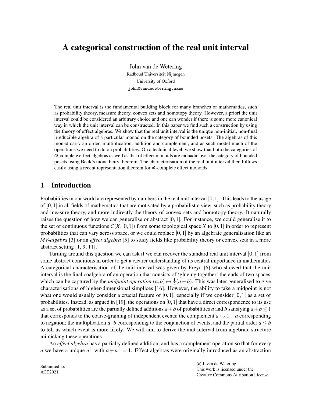 16w5099—INTERVAL ANALYSIS AND CONSTRUCTIVE MATHEMATICS Douglas Bridges (University of Canterbury), Hannes Diener (University of Canterbury), Baker Kearfott (University of Louisiana at Lafayette), Vladik Kreinovich (University of Texas at El Paso), Patricia Melin (Tijuana Institute of Technology), Raazesh Sainudiin (University of Canterbury), Helmut Schwichtenberg (University of Munich) 13–18 November 2016 1 Overview of the Field 1.1 Constructive Mathematics In this case, we have two fields to overview—constructive mathematics and interval analysis—one of the main objectives of the workshop being to foster joint research across the two. By ‘constructive mathematics’ we mean ‘mathematics using intuitionistic logic and an appropriate set or typetheoretic foundation’. Although the origins of the field go back to Brouwer, over 100 years ago, it was the publication, in 1967, of Errett Bishop’s Foundations of Constructive Analysis [16, 17] that began the modern revival of the field. Bishop adopted the highlevel viewpoint of the working mathematical analyst (he was already famous for his work in classical functional analysis and several complex variables), and devel oped constructively analysis across a wide swathe of the discipline: real, complex, and functional analysis, as well as abstract integration/measure theory. The significant aspect of his work is that the exclusive use of intuitionistic logic guaranteed that each proof embodied algorithms that could be extracted, encoded, and machineimplemented. For a rather simple example, Bishop’s proof of the fundamental theorem of algebra is, in effect, an algorithm enabling one to find the roots of a given complex polynomial; contrast this with the standard undergraduate proofs, such as the reductio ad absurdum one using Liouville’s theorem. -