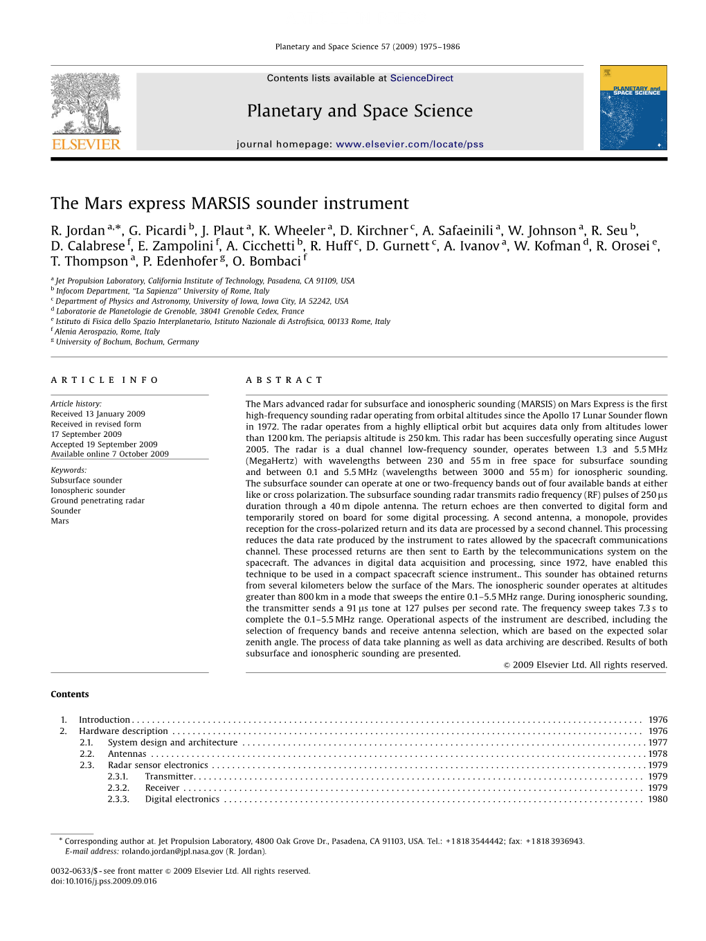 Space Sci Rev (2020) 216:128 https://doi.org/10.1007/s11214-020-00740-4 Radar Imager for Mars’ Subsurface Experiment—RIMFAX Svein-Erik Hamran1 · David A. Paige2 · Hans E.F. Amundsen3 · Tor Berger 4 · Sverre Brovoll4 · Lynn Carter5 · Leif Damsgård4 · Henning Dypvik1 · Jo Eide6 · Sigurd Eide1 · Rebecca Ghent7 · Øystein Helleren4 · Jack Kohler8 · Mike Mellon9 · Daniel C. Nunes10 · Dirk Plettemeier11 · Kathryn Rowe2 · Patrick Russell2 · Mats Jørgen Øyan4 Received: 15 May 2020 / Accepted: 25 September 2020 © The Author(s) 2020 Abstract The Radar Imager for Mars’ Subsurface Experiment (RIMFAX) is a Ground Pen- etrating Radar on the Mars 2020 mission’s Perseverance rover, which is planned to land near a deltaic landform in Jezero crater. RIMFAX will add a new dimension to rover investiga- tions of Mars by providing the capability to image the shallow subsurface beneath the rover. The principal goals of the RIMFAX investigation are to image subsurface structure, and to provide information regarding subsurface composition. Data provided by RIMFAX will aid Perseverance’s mission to explore the ancient habitability of its field area and to select a set of promising geologic samples for analysis, caching, and eventual return to Earth. RIM- FAX is a Frequency Modulated Continuous Wave (FMCW) radar, which transmits a signal swept through a range of frequencies, rather than a single wide-band pulse. The operating frequency range of 150–1200 MHz covers the typical frequencies of GPR used in geology. In general, the full bandwidth (with effective center frequency of 675 MHz) will be used for The Mars 2020 Mission Edited by Kenneth A. -
