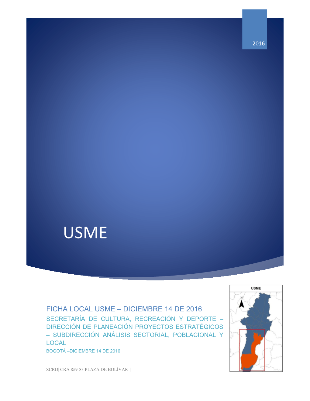 Plaza de Usme, Centro de Servicios René Fernando Castillo Aldana Universidad de los Andes, Facultad de Arquitectura y Diseño, Departamento de Arquitectura, Bogotá D.C, 2010 Plaza de Usme, Centro de Servicios René Fernando Castillo Aldana Proyecto de Grado Director Arquitecto Daniel Bermúdez Universidad de los Andes, Facultad de Arquitectura y Diseño, Departamento de Arquitectura, Bogotá D.C, 2010 CONTENIDO RESUMEN 3 INTRODUCCION 5 1 EL LUGAR 7 1.1Historia 7 1.2Plan de Ordenamiento Territorial 9 1.2.1 Plan Estratégico Nuevo Usme 10 1.3 Actualidad 15 2 REFERENTES 19 2.1 Plaza De Bolívar 20 2.2 Plaza de Suba 21 2.3 Plaza de Engativa 22 2.4 Plaza de Usaquen 23 2.5 SuperCADE de las Américas 25 2.6 Rediseño de procesos y procedimiento alcaldía local de chapinero 27 2.7 Estación de Policía de Belén 28 2.8 Barrió la Malagueira 29 1 3 EL PROYECTO 31 3.1 Escala Urbana 31 3.2 El Edificio 34 CONCLUSIONES 47 BIBLIOGR AFIA 48 2 RESUMEN El centro Urbano del antiguo municipio de Usme no ha tenido mayores cambios desde el año de 1650 cuando fue fundado como San Pedro de Usme. Para la conformación de la plaza se determino la construcción de un edifico para el CAI de policía, dándole un mejor lugar y presencia en la plaza que la casa en la que se encuentra en el costa sur, la creación de un centro administrativo Distrital, para una atención completa a la zona, la reubicación de la Alcaldía local en una instalación más competente para sus dependencias y la reunión de todas las subsedes de las secretarias distritales en la plaza; a demás de la conformación de vivienda productiva con la posibilidad de comercio en primer piso; un C.A.M.I Y la renovación de la actual alcaldía como la casa de la cultura. -