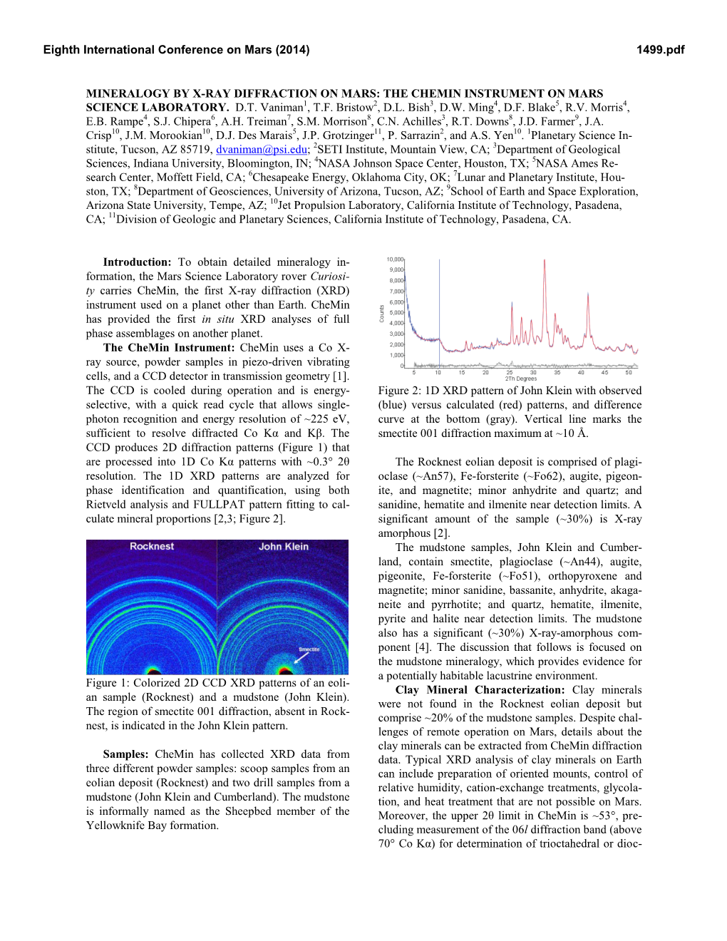 Ninth International Conference on Mars 2019 (LPI Contrib. No. 2089) 6230.pdf A MINIATURIZED CHEMIN XRD/XRF FOR FUTURE MARS EXPLORATION. B. Lafuente1, P. Sarrazin1, T. F. Bristow2, D. F. Blake2, M. Gailhanou3, J. Chen4, K. Thompson1, R. Walroth2, K. Zacny5, R. T. Downs6, and A. Yen7, 1SETI Institute, Mountain View, CA ([email protected]), 2Exobiology, NASA ARC, Moffett Field, CA, 3CNRS, IM2NP UMR, Marseille, France, 4Baja Technology, Tempe, AZ, 5Honeybee Robotics Spacecraft Mecha- nisms Corp., Pasadena, CA, 6Geosciences, Univ. Arizona, Tucson AZ, 7JPL, Pasadena, CA. Introduction: X-ray Diffraction (XRD) and X-ray ergy-selective detection of XRD photons in Mars’ ra- Fluorescence (XRF) analyses provide the most diag- diative environment. The CheMinX XRD geometry is nostic and complete characterization of rocks and soil based on an architecture demonstrated by hundreds of by any spacecraft-capable technique, improved upon commercial XRD instruments (Terra, commercial spin- only by sample return and analysis in terrestrial labora- off of CheMin, Fig. 1). This design resulted from a tories. In a complex sample such as a basalt, XRD can ray-tracing study of XRD geometries based on high as- definitively identify and quantify all minerals, establish pect-ratio detectors. It was found that reduced surface their individual elemental compositions and quantify area detectors can be used with no loss in throughput, the amount of the amorphous component. When cou- angular resolution or angular range, the loss in detector pled with XRF, the composition of the amorphous coverage being fully compensated for by an optimized component can be determined as well. collimator design. The MSL CheMin instrument, the first XRD instru- In its basic implementation CheMinX will provide ment flown in space, established the quantitative min- a resolution of 0.3° 2θ FWHM, slightly improved over eralogy of the Mars soil [1], characterized the first hab- CheMin’s 0.35°. -