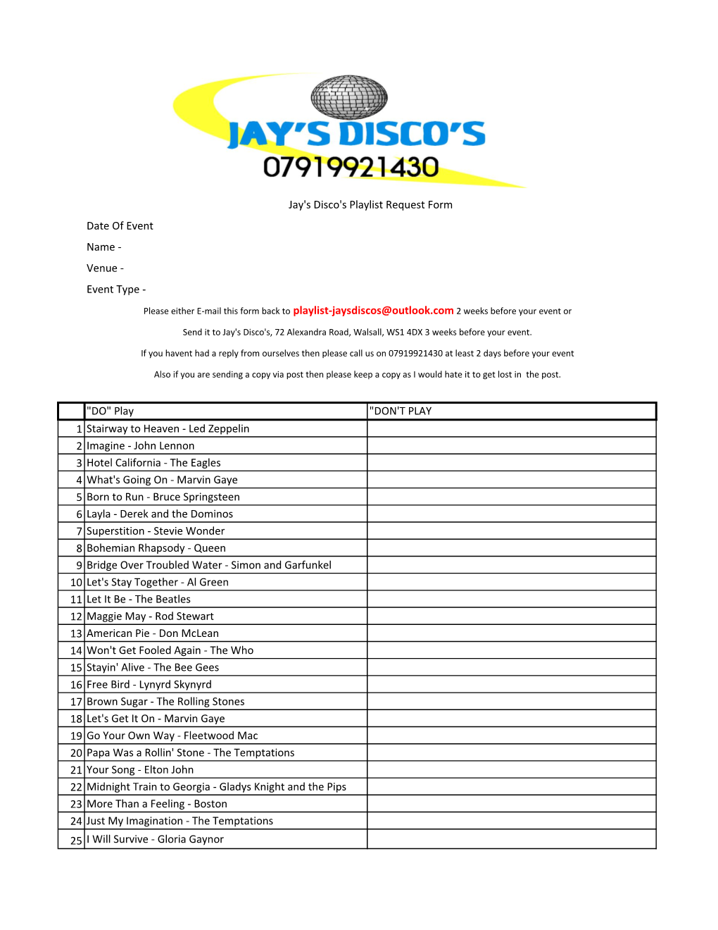HERE I AM BABY AL GREEN LET’S STAY TOGETHER AL GREEN DON’T STOP BELIEVING JOURNEY ANY WAY YOU WANT IT JOURNEY GIVE IT TO ME BABY RICK JAMES SUPERFREAK RICK JAMES HOME MICHAEL BUBLE EVERYTHING MICHAEL BUBLE WORKING FOR THE WEEKEND LOVERBOY SHAKE YOUR BODY DOWN MICHAEL JACKSON BILLIE JEAN MICHAEL JACKSON BEAT IT MICHAEL JACKSON IT’S YOUR THING ISLEY BROTHERS SHOUT ISLEY BROTHERS BEAUTIFUL GIRL SEAN KINGSTON ALL NIGHT LONG LIONEL RICHIE LISTEN TO THE MUSIC DOOBIE BROTHERS LONG TRAIN RUNNING DOOBIE BROTHERS ISN’T SHE LOVELY STEVIE WONDER I WISH STEVIE WONDER FOR ONCE IN MY LIFE STEVIE WONDER SUPERSTITIOUS STEVIE WONDER SIR DUKE STEVIE WONDER REGGAE WOMAN STEVIE WONDER SIGNED SEALED DELIVERED STEVIE WONDER ANOTHER STAR STEVIE WONDER WHAT’S GOING ON MARVIN GAYE LET'S GET IT ON MARVIN GAYE FISHING IN THE DARK NITTY GRITTY DIRT BAND SATISFACTION ROLLING STONES HONKY TONK WOMAN ROLLING STONES AMERICAN BAND GRAND FUNK RAILROAD SOME KIND OF WONDERFUL GRAND FUNK RAILROAD DAYS LIKE THIS VAN MORRISON INTO THE MYSTIC VAN MORRISON CRAZY LOVE VAN MORRISON MOONDANCE VAN MORRISON TUPELO HONEY VAN MORRISON BROWN EYED GIRL VAN MORRISON THE WAY YOU LOOK TONIGHT FRANK SINATRA LOVELY DAY BILL WITHERS USE ME BILL WITHERS JUST THE TWO OF US BILL WITHERS SWEET CAROLINE NEIL DIAMOND BE YOUNG BE FOOLISH BE HAPPY THE TAMS YOU AND ME ROBERT BRADLEY AIN’T TOO PROUD TO BEG THE TEMPTATIONS MY GIRL THE TEMPTATIONS JUST MY IMAGINATION THE TEMPTATIONS HOW SWEET IT IS JAMES TAYLOR HEAVEN LOS LONELY BOYS YOU ARE SO BEAUTIFUL JOE COCKER AT LAST ETTA JAMES COULD YOU BE LOVED -