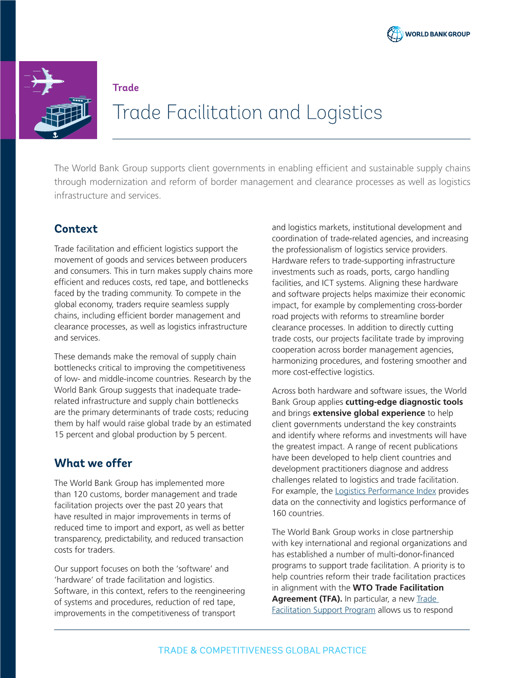 CHAPTER 6 THE CRITICAL ROLE OF TRADE FACILITATION IN SUPPORTING ECONOMIC DIVERSIFICATION AND STRUCTURAL REFORMS Contributed by the World Bank, the United Nations Conference on Trade and Development and the Organisation for Economic Co-operation and Development Abstract: Two years after the entry into force of the WTO Trade Facilitation Agreement, it is time for an initial stock-taking. The experience of the World Bank Group Trade Facilitation Support Program (TFSP) and the UNCTAD Trade Facilitation Program, both major providers of trade-related assistance, as well as OECD’s analytical work provides relevant insights. In these early years, support has been generally directed to the “foundational” measures of the Agreement, such as National Trade Facilitation Committees. These will oversee implementation; time release studies, providing a baseline to measure progress; and risk management policies and procedures, a precondition for implementation of simplified control and release processes. Progress is being made. TFSP and OECD research find that the level of alignment with the Agreement is increasing, with notable improvements in publication of measures, automation and streamlining of procedures and engagement with the trade community. Positive impacts from these aid-for-trade supported reforms have also been registered. Country reports and periodic time release studies show reduction in customs physical inspections, elimination of unnecessary documents, automation of manual processing steps, and consequent reduction of clearance times. World Bank surveys (the Logistics Performance Index (LPI) and Doing Business) likewise show a positive trend in these aid-supported countries. AID FOR TRADE AT A GLANCE 2019: ECONOMIC DIVERSIFICATION AND EMPOWERMENT - © OECD, WTO 2019 161 CHAPTER 6. -