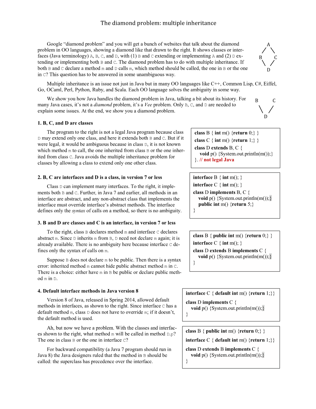 JOURNAL OF OBJECT TECHNOLOGY Online at http://www.jot.fm. Published by ETH Zurich, Chair of Software Engineering ©JOT, 2005 Vol. 4, No.2, March-April 2005 The Theory of Classification Part 17: Multiple Inheritance and the Resolution of Inheritance Conflicts Anthony J H Simons, Department of Computer Science, University of Sheffield, Regent Court, 211 Portobello Street, Sheffield S1 4DP, UK 1 INTRODUCTION This is the seventeenth article in a regular series on object-oriented theory for non- specialists. Using a second-order λ-calculus model, we have previously modelled the notion of inheritance as a short-hand mechanism for defining subclasses by extending superclass definitions. Initially, we considered the inheritance of type [1] and implementation [2] separately, but later combined both of these in a model of typed inheritance [3]. By simplifying the short-hand inheritance expressions, we showed how these are equivalent to canonical class definitions. We also showed how classes derived by inheritance are type compatible with their superclass. Further aspects of inheritance have included method combination [4], mixin inheritance [5] and inheritance among generic classes [6]. Most recently, we re-examined the ⊕ inheritance operator [7], to show how extending a class definition (the intension of a class) has the effect of restricting the set of objects that belong to the class (the extension of the class). We also added a type constraint to the ⊕ operator, to restrict the types of fields that may legally be combined with a base class to yield a subclass. By varying the form of this constraint, we modelled the typing of inheritance in Java, Eiffel, C++ and Smalltalk. -