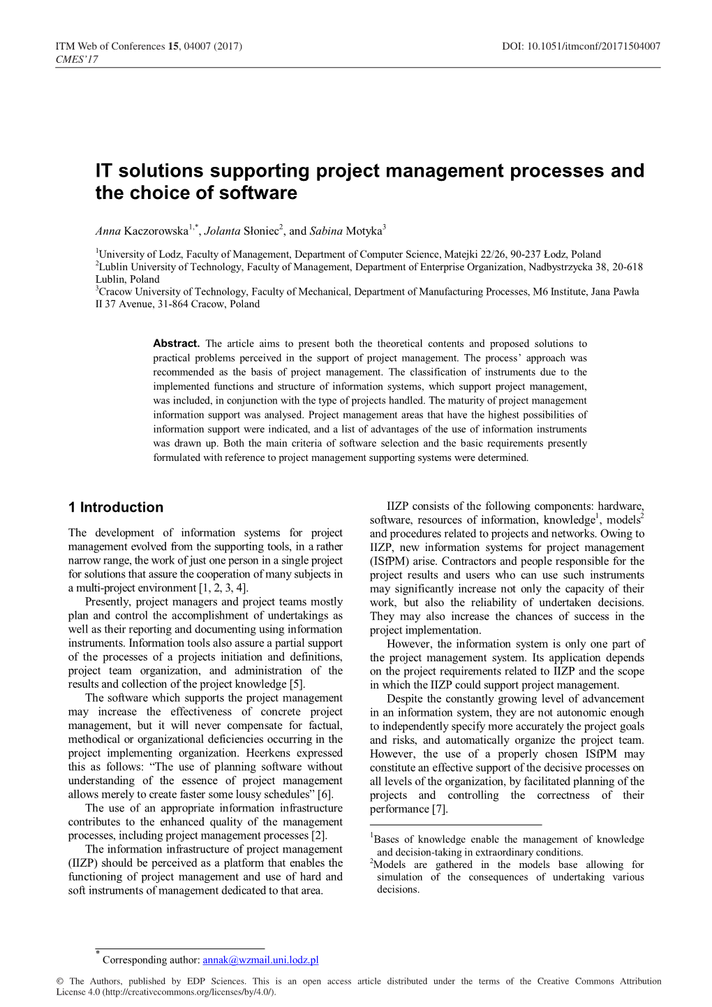 IT Solutions Supporting Project Management Processes and the Choice of Software